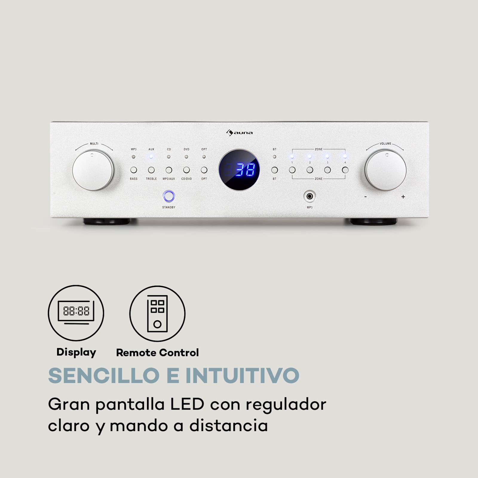 Gracias a sus posibilidades de conexión, el amplificador digital AMP-CD950 DG de auna regula el sonido HiFi doméstico como ningún otro. El aparato dispone de una entrada óptica, una interfaz Bluetooth, entradas para CD y DVD, así como entradas de MP3 y auxiliar para conectar fácilmente numerosas fuentes de audio. El procesador de señales digitales integrado ofrece valiosas funciones para mejorar la señal, por ejemplo, mediante la supresión de ruidos o ecos. Como es habitual en los amplificadores, los agudos, los graves y el balance se pueden ajustar al gusto de cada uno. El amplificador digital AMP-CD950 DG de auna exhibe su fuerza absoluta al emitir la señal de audio totalmente regulada: las cuatro zonas estéreo con una potencia de salida de 100 W RMS cada una para proporcionan una experiencia de audio potente y controlada por separado en hasta cuatro habitaciones diferentes. Alternativamente, también cuenta con una salida de grabadora para grabar las divertidas tardes musicales. El diseño compacto y sencillo del amplificador digital se completa con un atractivo panel frontal negro con una gran pantalla led y controles plateados. Para facilitar el control del aparato, en el envío se suministra un mando a distancia con un amplio abanico de funciones.