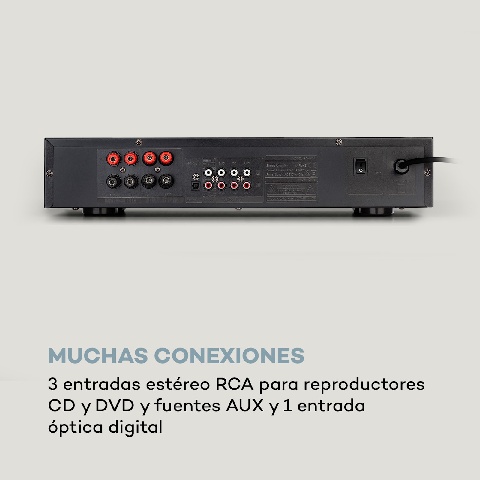 Las opciones de conexión del amplificador AV2-CD608BT de auna respetan los estándares Hi-Fi domésticos. De esta manera, ofrece 3 entradas RCA estéreo para reproductores de CD y DVD, así como 1 entrada auxiliar RCA para equipos estéreo. Además, dispone de 1 entrada óptica digital, 1 puerto y 1 conexión jack de 3,5 mm para reproductores de MP3. Gracias a la interfaz Bluetooth integrada, puede reproducir fácilmente los archivos de audio almacenados en teléfonos inteligentes, tabletas u ordenadores. Un regulador de 2 canales ajusta los agudos, graves, volumen y equilibrio de las señales entrantes, que luego llegan a los 4 altavoces a través de las 4 salidas. Todas las funciones se controlan directamente en el amplificador o cómodamente mediante el mando a distancia.
