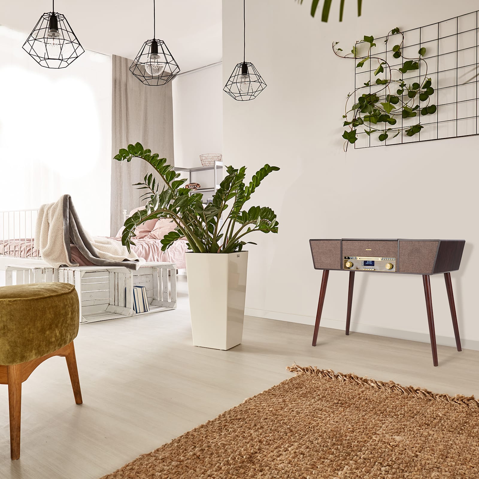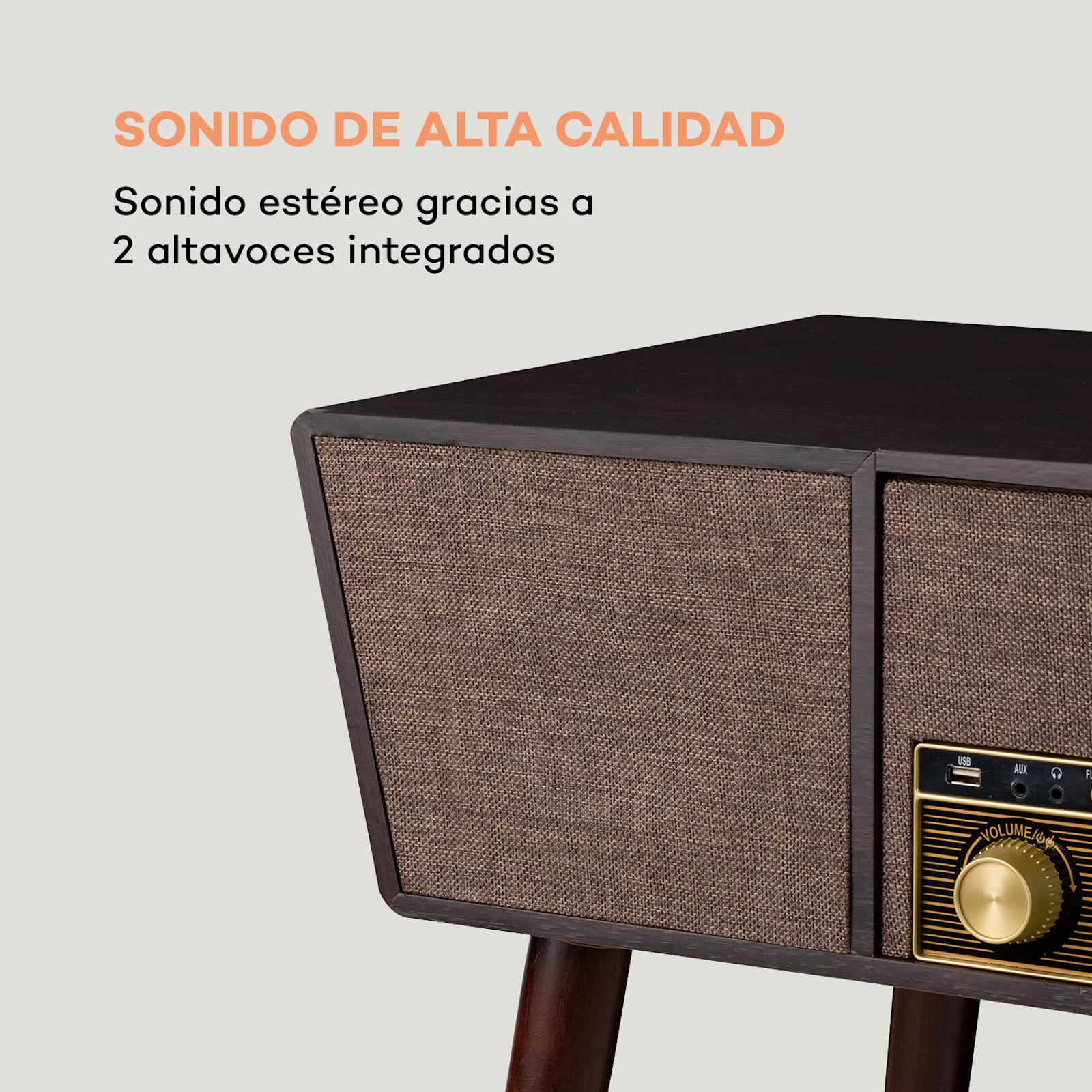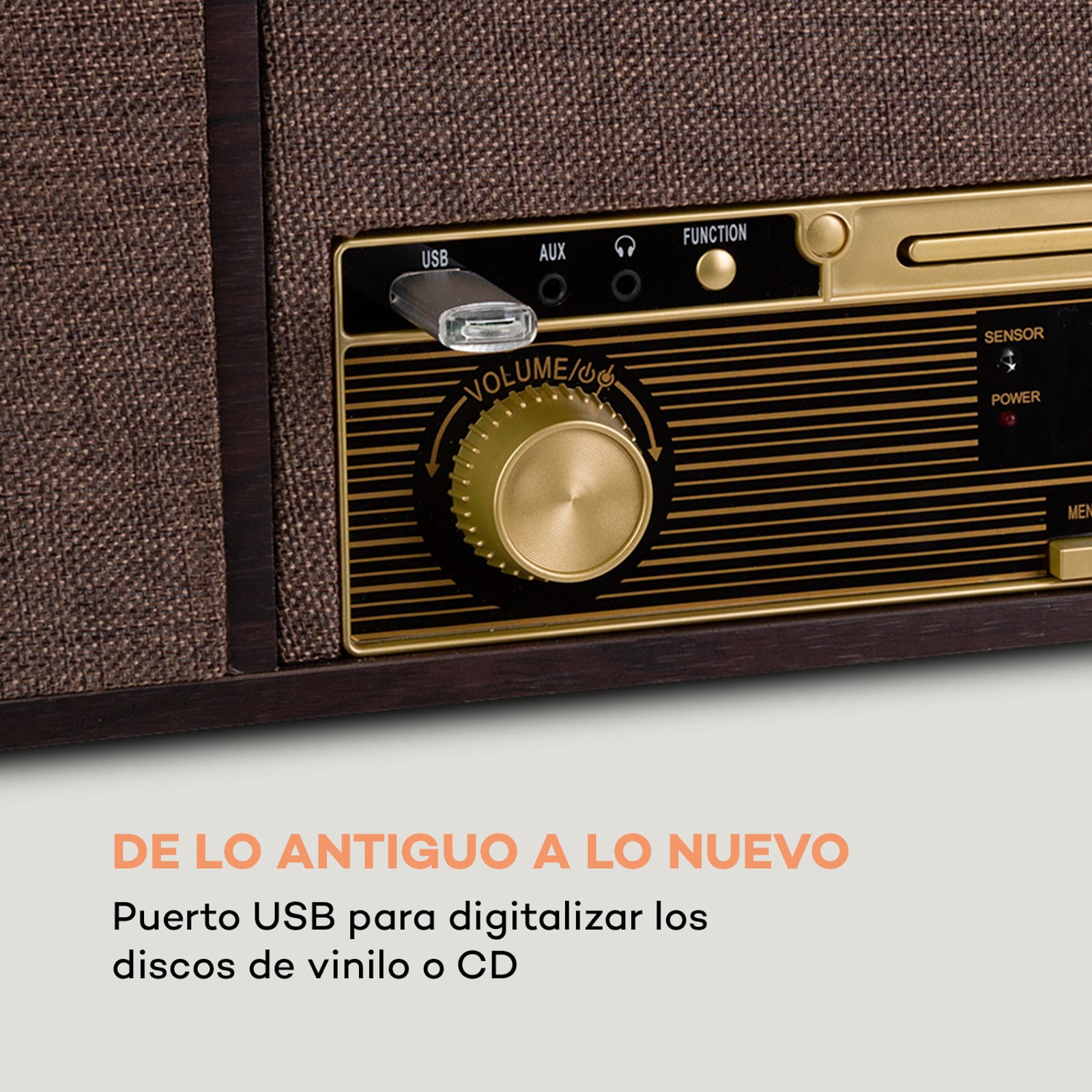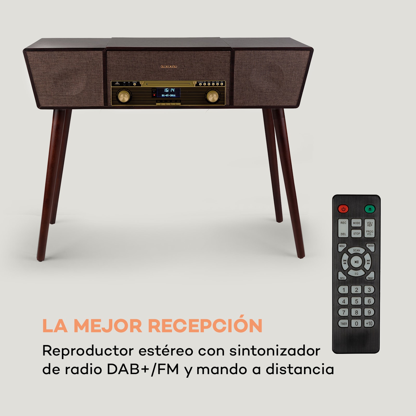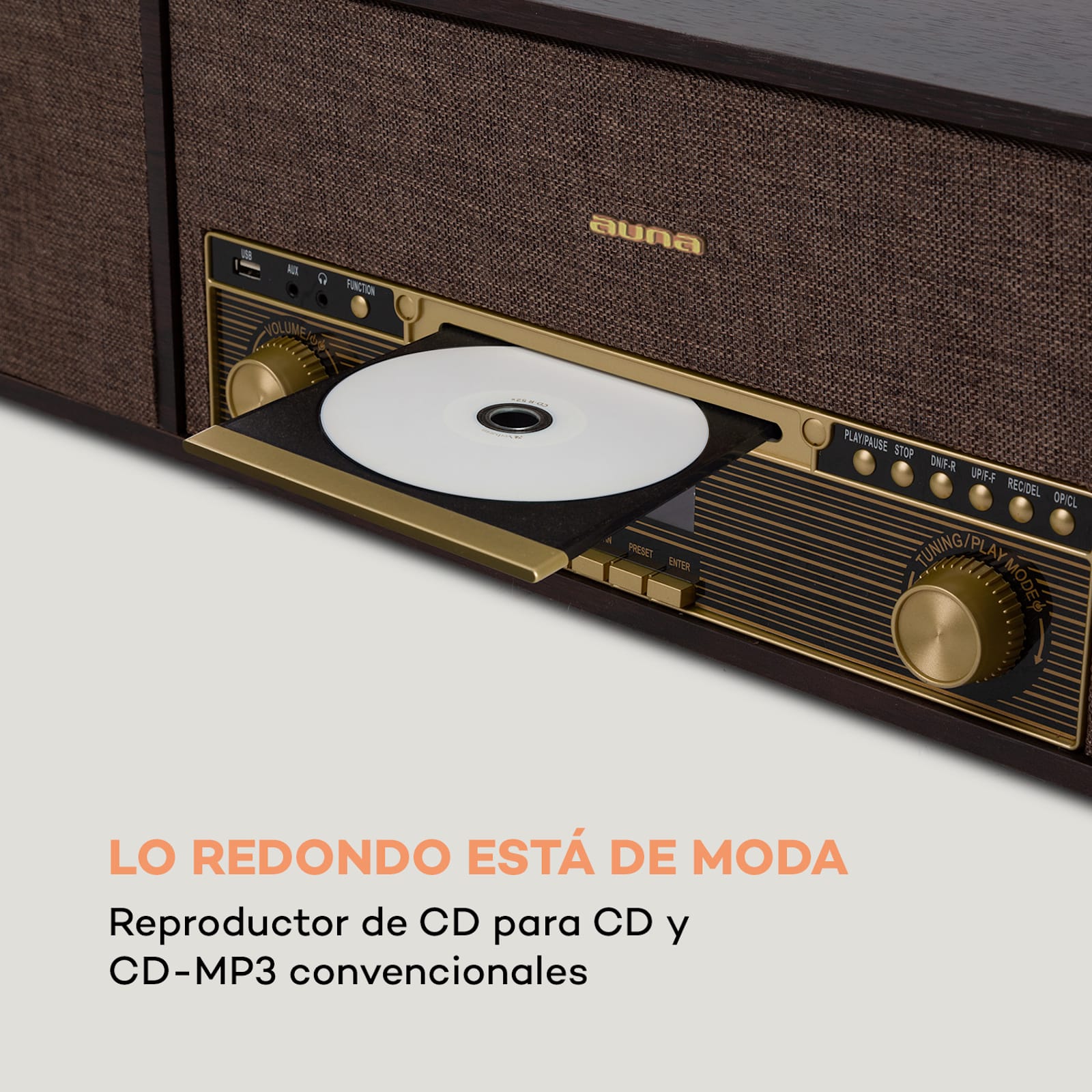 Las opciones de reproducción clásica incluyen una plataforma giratoria que puede reproducir vinilos a tres velocidades: 33 1/3, 45 y 78 rpm. El sistema también tiene una conexión Bluetooth para transmitir música desde un smartphone, tableta o portátil, un reproductor de CD para CDs MP3 y un sintonizador de radio DAB+/UKW. El tocadiscos retro auna tiene una interfaz USB con capacidad para MP3, equipada con función de grabación: la música reproducida en el tocadiscos o reproductor de CD puede almacenarse en un drive USB y editarse para su posterior uso en el PC.