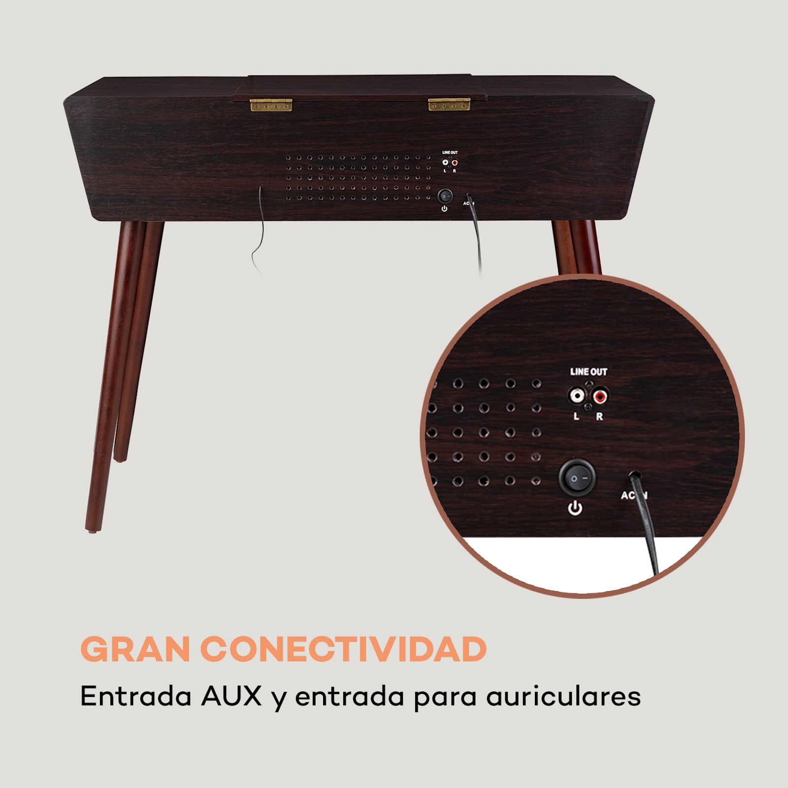 El elegante maletín retro de MDF macizo con 4 patas extraíbles convierte el tocadiscos retro Belle Epoque 1912 de auna en un objeto de diseño versátil.