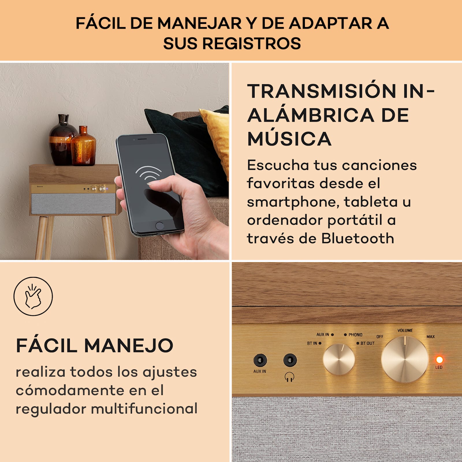 Un diseño nostálgico que pondrá en marcha su colección de vinilos con estilo: el elegante tocadiscos Berklee TT Case de aunallama la atención en todas las habitaciones y sorprende con una maravillosa experiencia musical. Gracias al adaptador de 45 RPM que lo acompaña, puede reproducir discos de larga duración y singles de 45 o 33 1/3 revoluciones por minuto con gran calidad. Pero eso no es todo: además de disfrutar de tu colección de discos, puedes incluso escuchar archivos de música digital con el tocadiscos con patas Sólo tienes que conectar tu PC, tableta o smartphone a través de Bluetooth o conectar otros dispositivos de reproducción y almacenamiento a través de la entrada auxiliar.