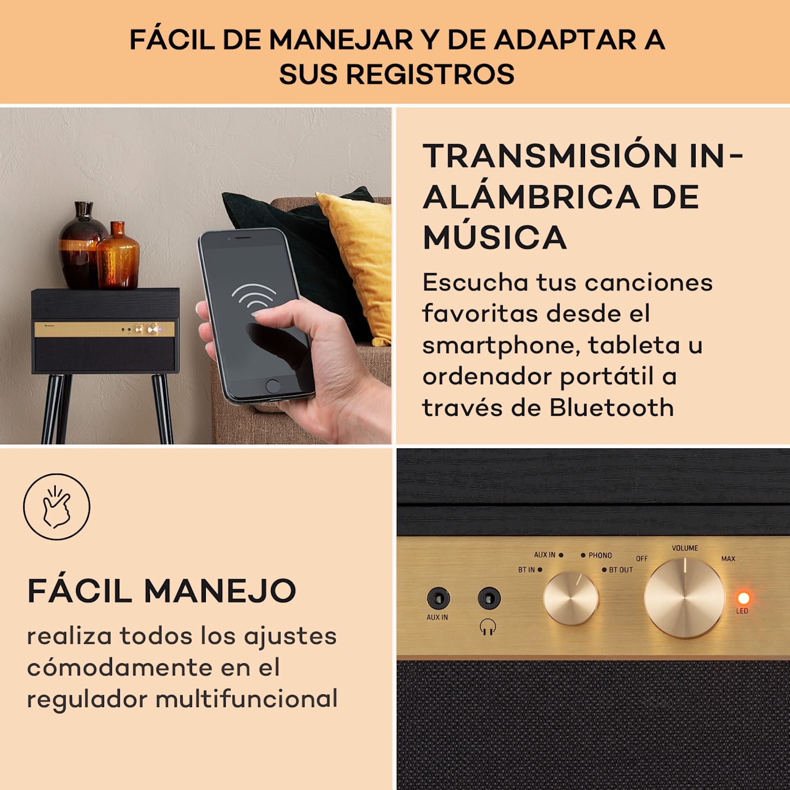 Un diseño nostálgico que pondrá en marcha su colección de vinilos con estilo: el elegante tocadiscos Berklee TT Case de aunallama la atención en todas las habitaciones y sorprende con una maravillosa experiencia musical. Gracias al adaptador de 45 RPM que lo acompaña, puede reproducir discos de larga duración y singles de 45 o 33 1/3 revoluciones por minuto con gran calidad. Pero eso no es todo: además de disfrutar de tu colección de discos, puedes incluso escuchar archivos de música digital con el tocadiscos con patas Sólo tienes que conectar tu PC, tableta o smartphone a través de Bluetooth o conectar otros dispositivos de reproducción y almacenamiento a través de la entrada auxiliar.