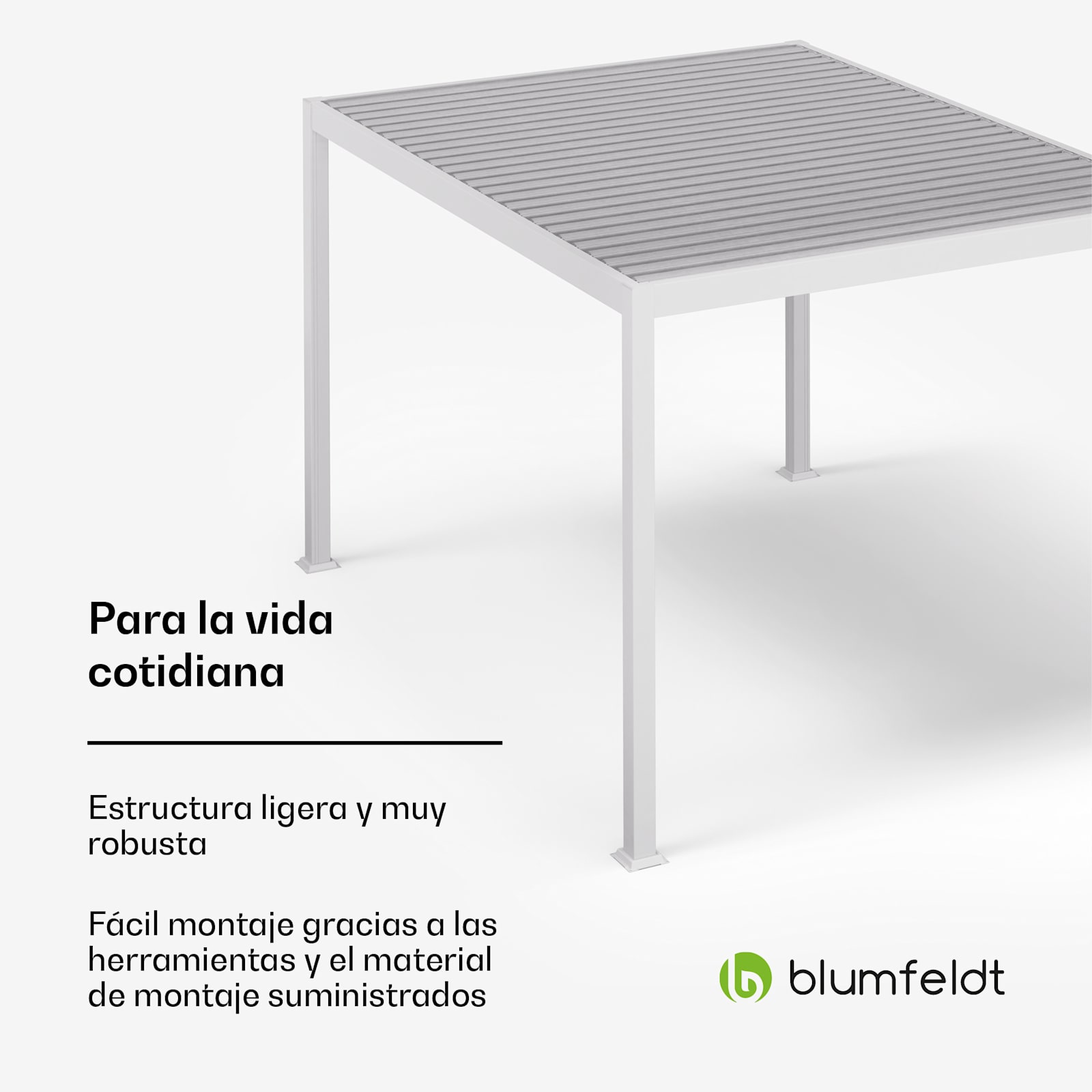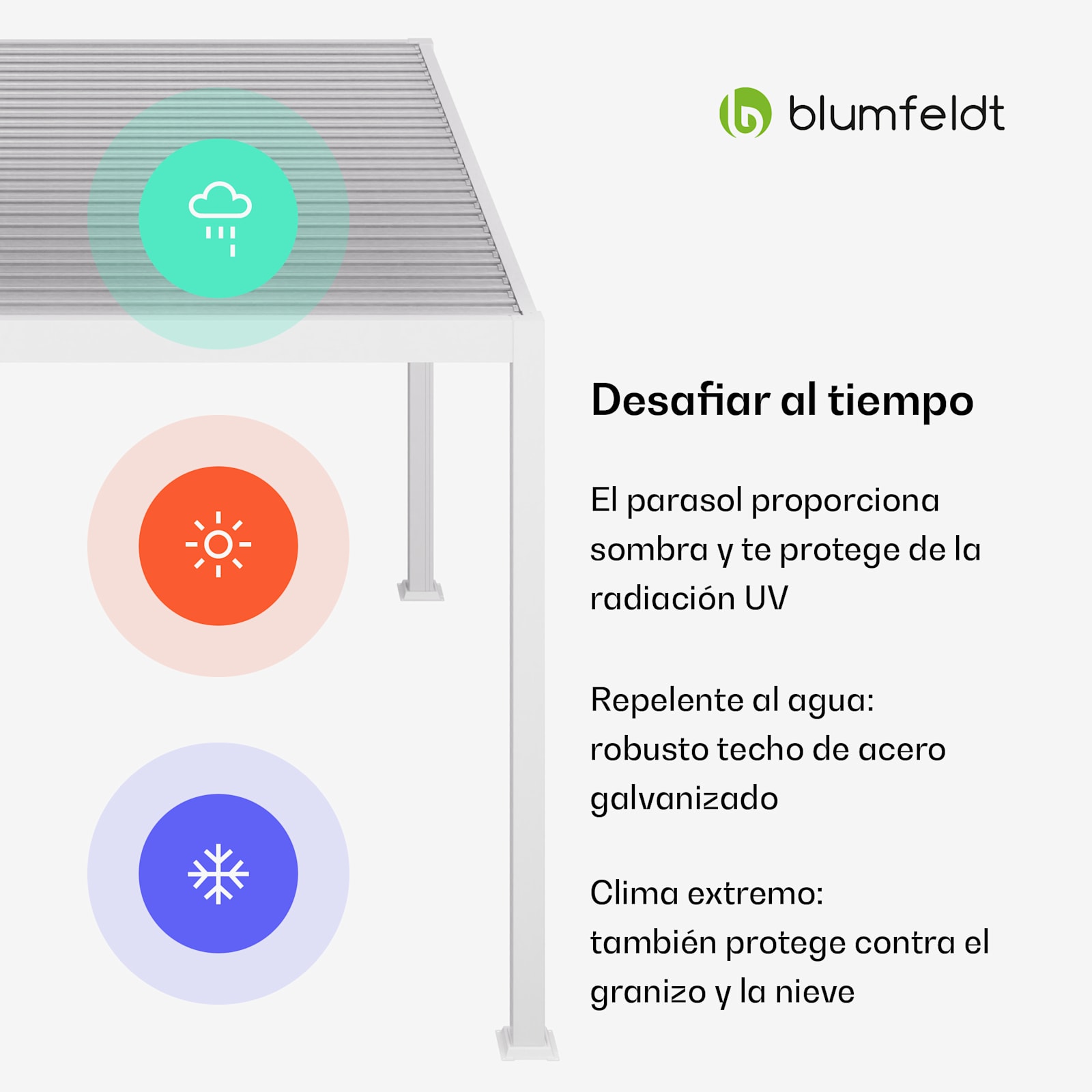 La versátil pérgola demuestra ser un auténtico todoterreno durante todo el año. El techo de lamas de acero galvanizado no sólo protege de la luz solar directa y de los peligros de la radiación UV. La pérgola Blumfeldt LuminaHaven también proporciona un refugio seguro contra la lluvia, la nieve e incluso el granizo, por lo que resulta ideal para guardar los muebles de jardín durante la estación fría.