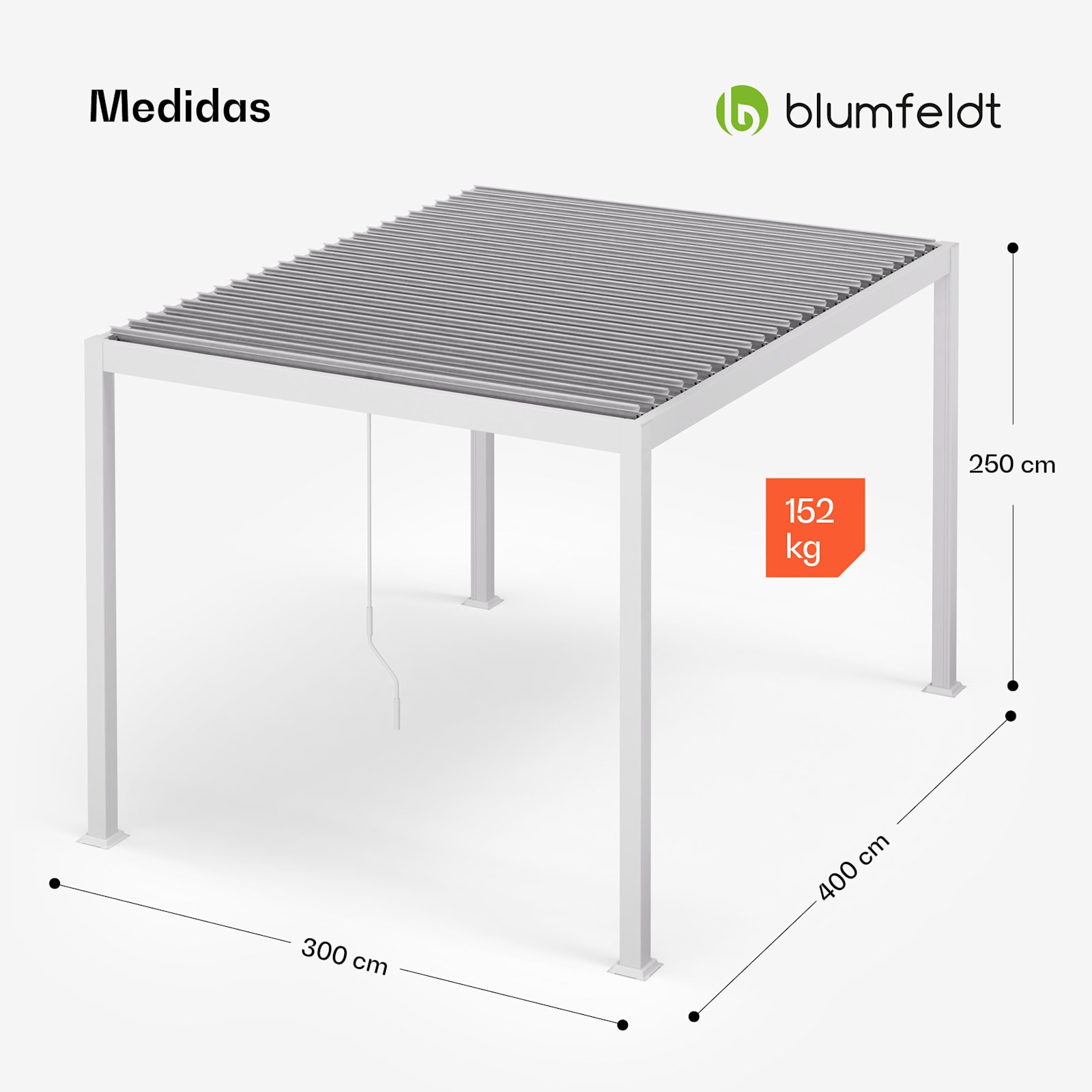 Los pilares de soporte de alta calidad garantizan una estabilidad suficiente incluso con fuertes ráfagas de viento. Gracias al recubrimiento en polvo, no tendrá que preocuparse por las antiestéticas manchas de óxido en el suelo del patio. Gracias a su sencillo diseño, una superficie de 4×3 metros puede transformarse en un punto de atracción en el jardín con poco esfuerzo.