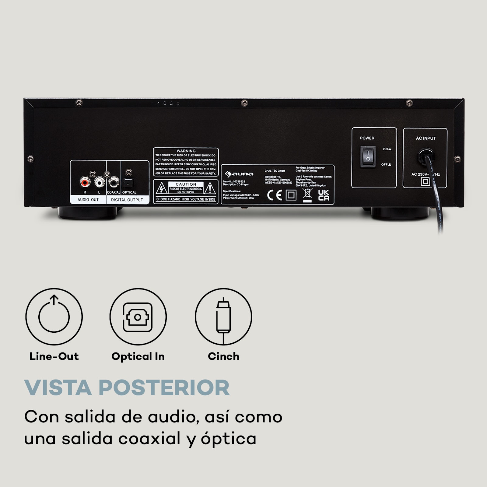 En la parte posterior de este reproductor de CD encontrarás una salida de audio con el que conectar fácilmente amplificadores, así como una salida coaxial y otra óptica. Su diseño sobrio resulta igualmente noble gracias a su panel frontal de aluminio. El reproductor de CD CD-1000 DG de auna se integrará perfectamente al ambiente moderno y hogareño de los amantes de la alta fidelidad.