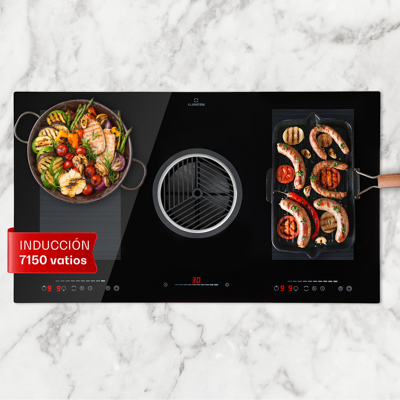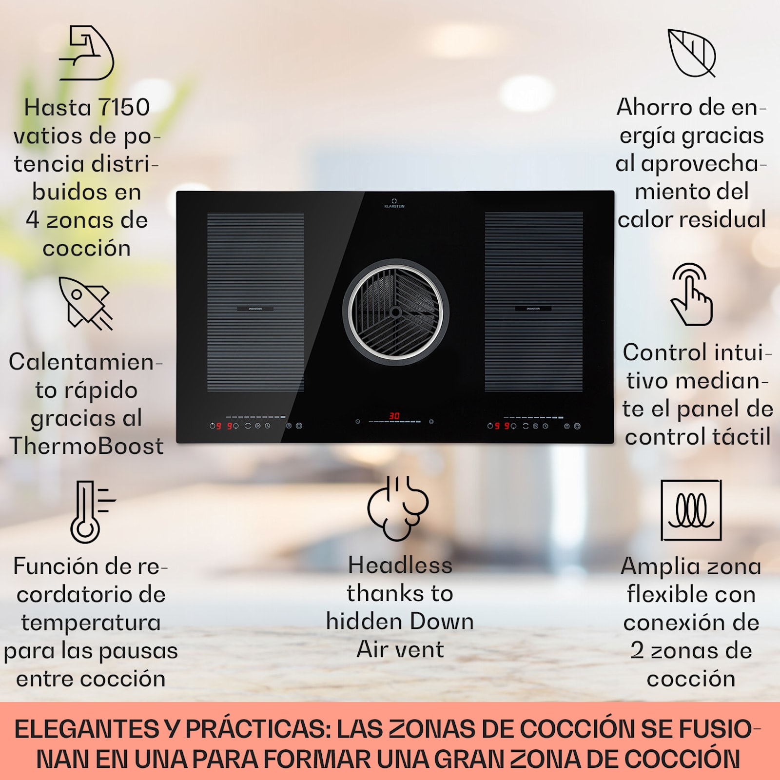 En el centro en lugar de sólo en: El Klarstein Full House 3.0 DownAir System revoluciona la cocina al combinar su placa de inducción directamente con un capó DownAir. Mejorado de nuevo en la 3ª generación, el sistema requiere ahora un espacio mínimo y es más potente que nunca.