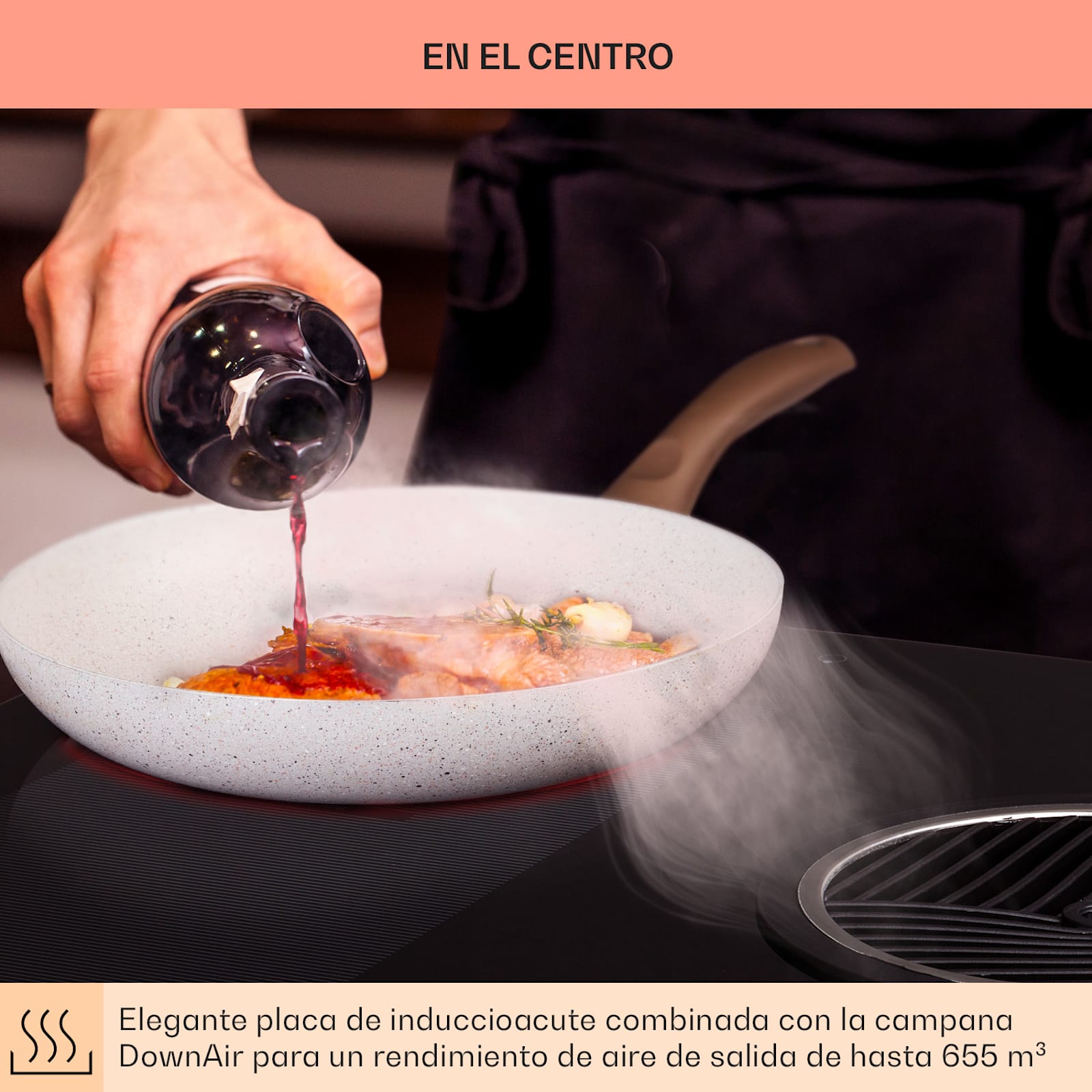 En el corazón de su nueva cocina se encuentra la potente unidad de aspiración: una campana DownAir en modo de aspiración. Como parte de la placa de cocción, nunca obstruye la vista y extrae el vapor y los olores directamente hacia abajo. Esto lo hace perfecto para las cocinas con isla central de cocción, así como para el mueble de cocina delgado. Con su sistema de 655 m³/h AeroEfficiency-, es especialmente eficaz y se oculta de forma invisible bajo la encimera.