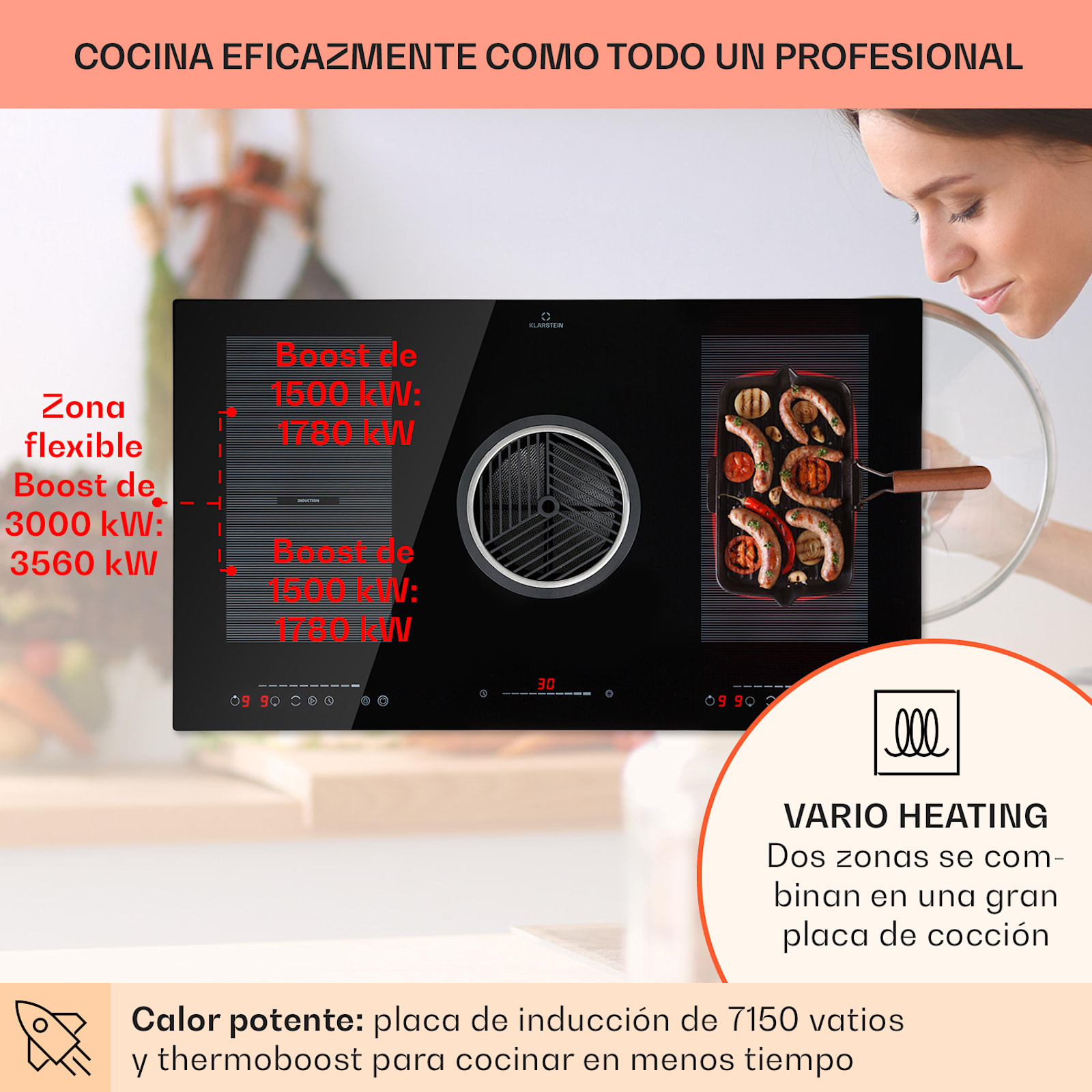 Cuatro potentes superficies de cocción traen a su cocina la placa de inducción del Klarstein Full House 3.0 DownAir System. Cada una de las dos placas de cocción se encuentra a la izquierda y a la derecha de la abertura de entrada redonda y, gracias al sistema VarioHeating, se unen prácticamente para formar una gran zona flexible cada una, por ejemplo para cacerolas u ollas grandes.