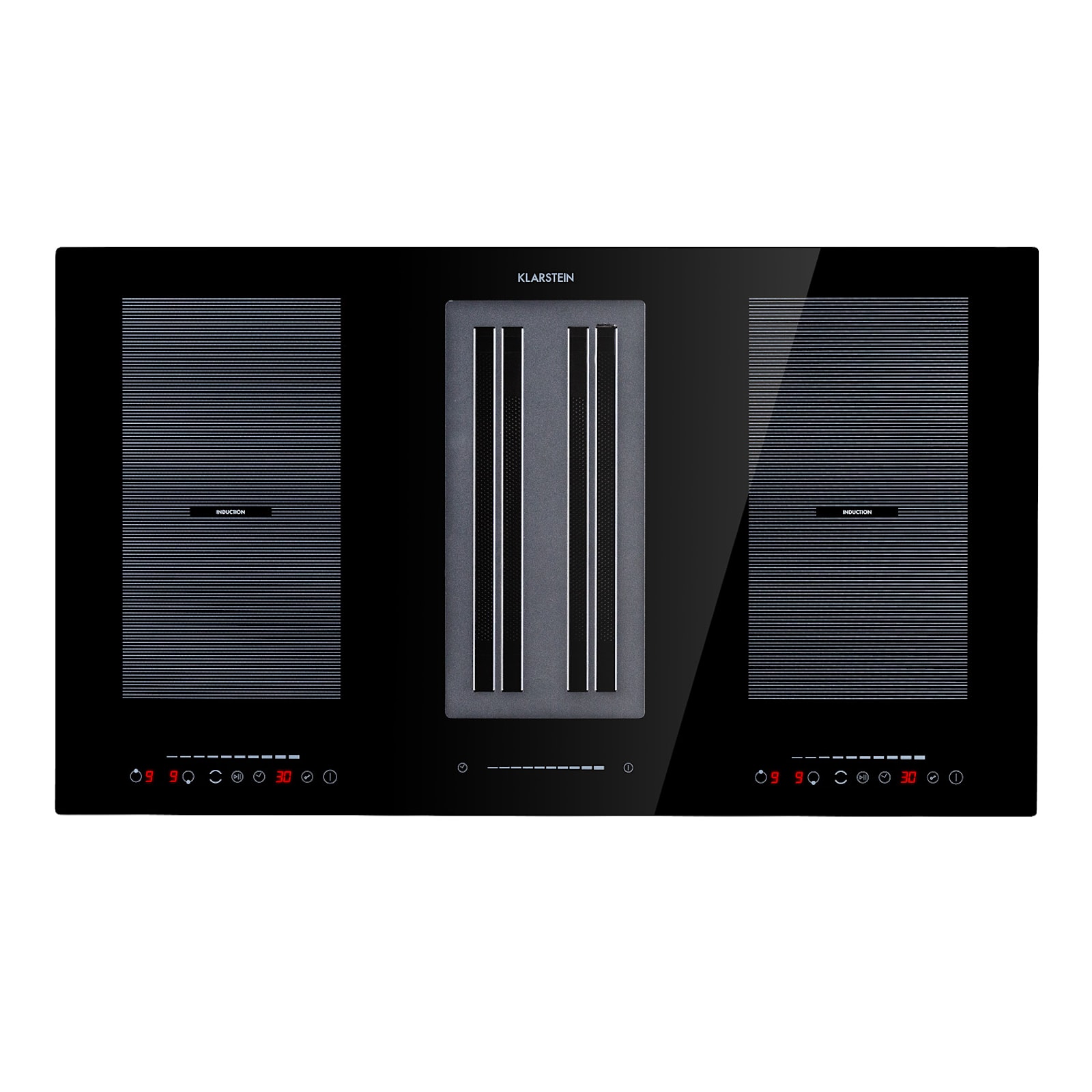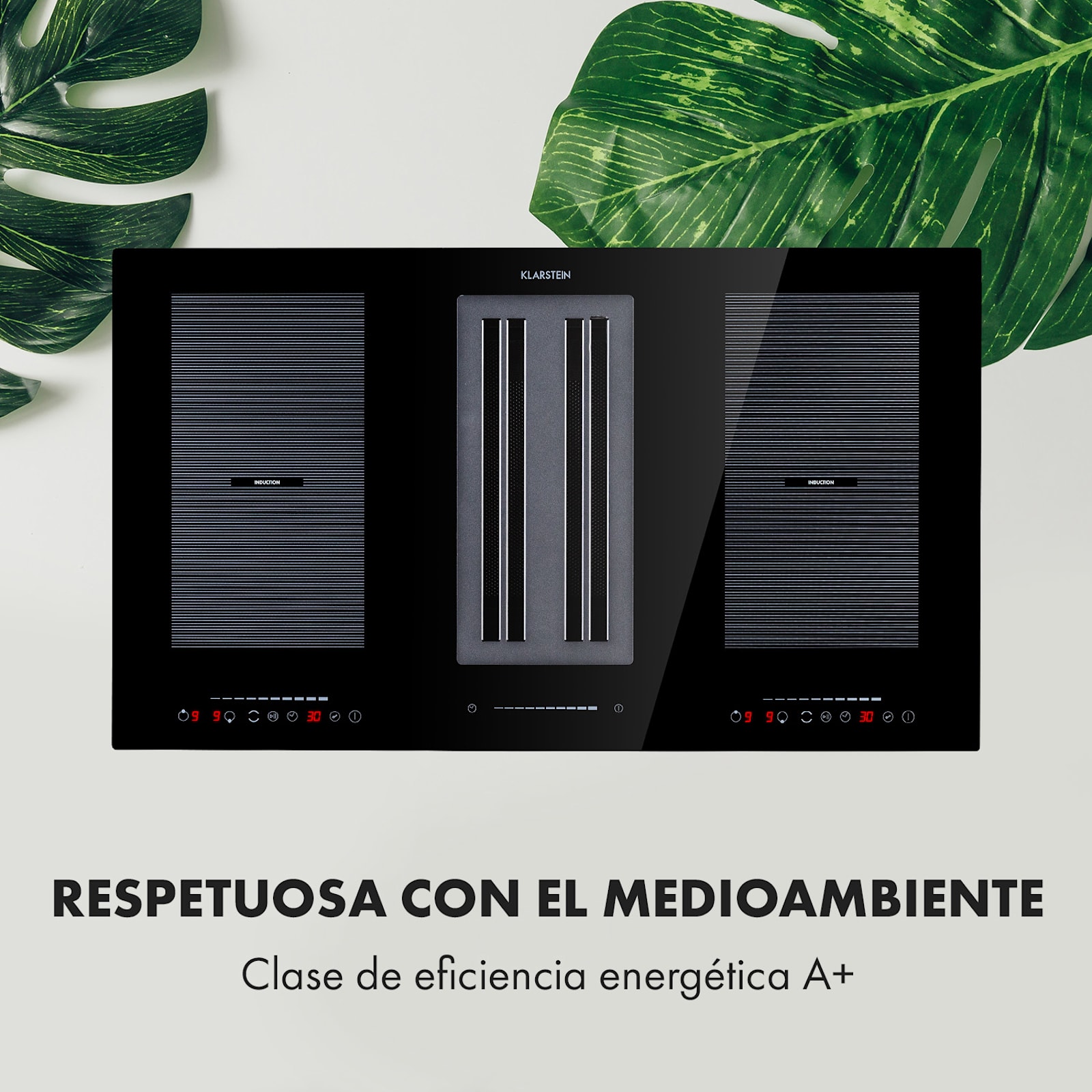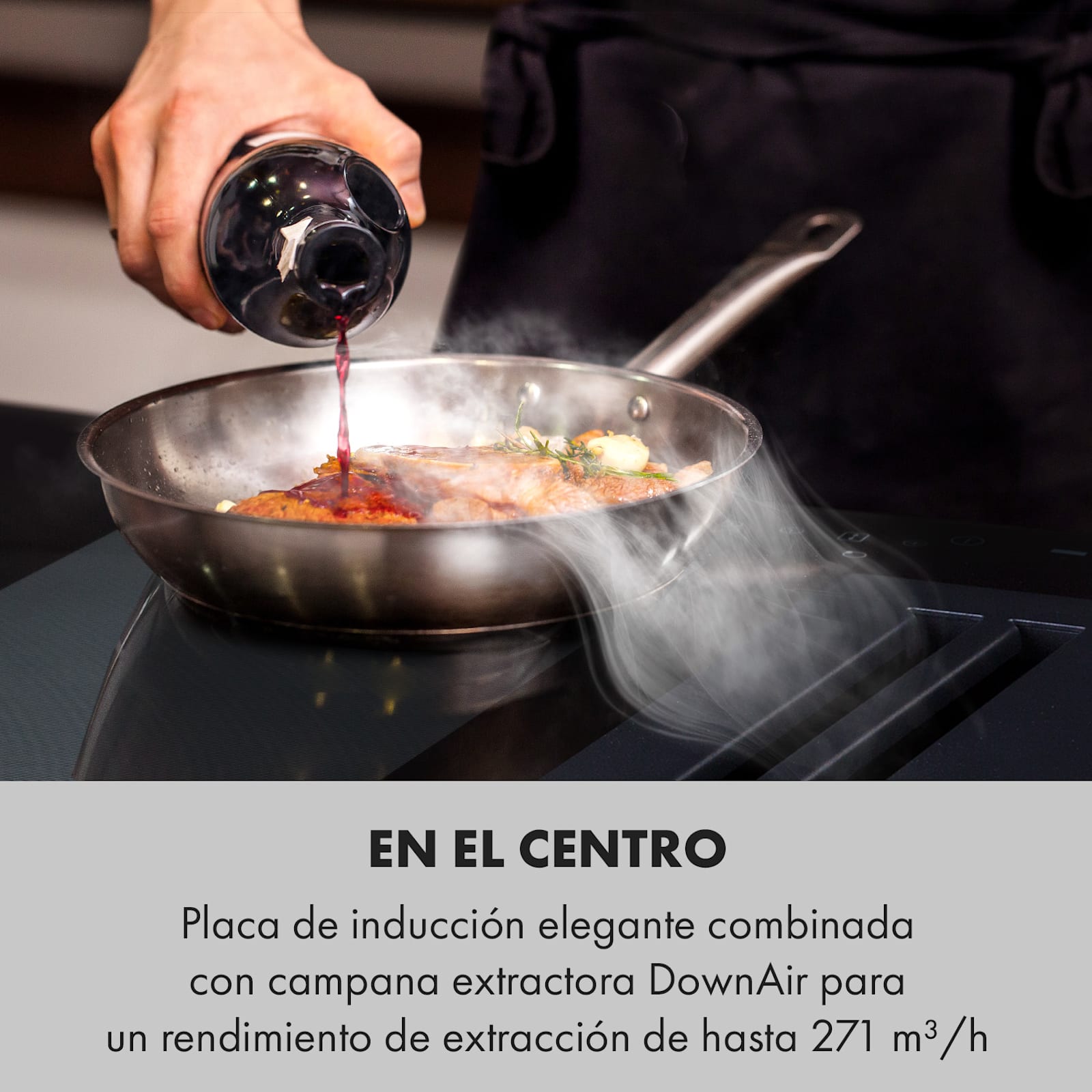 En el centro en lugar de a un lado: el sistema DownAir Full House 2.0 de Klarstein revoluciona la cocina al combinar su placa de inducción directamente con una campana extractora DownAir. Gracias a AeroEfficiency, el vapor y los olores de la cocina desaparecen directamente en el lugar donde se producen. El sistema utiliza la última tecnología, como VarioHeating para el funcionamiento de zonas flexibles, un panel de control táctil y EcoThermal-Control para el uso del calor residual, y los combina con una elegante superficie de cristal.