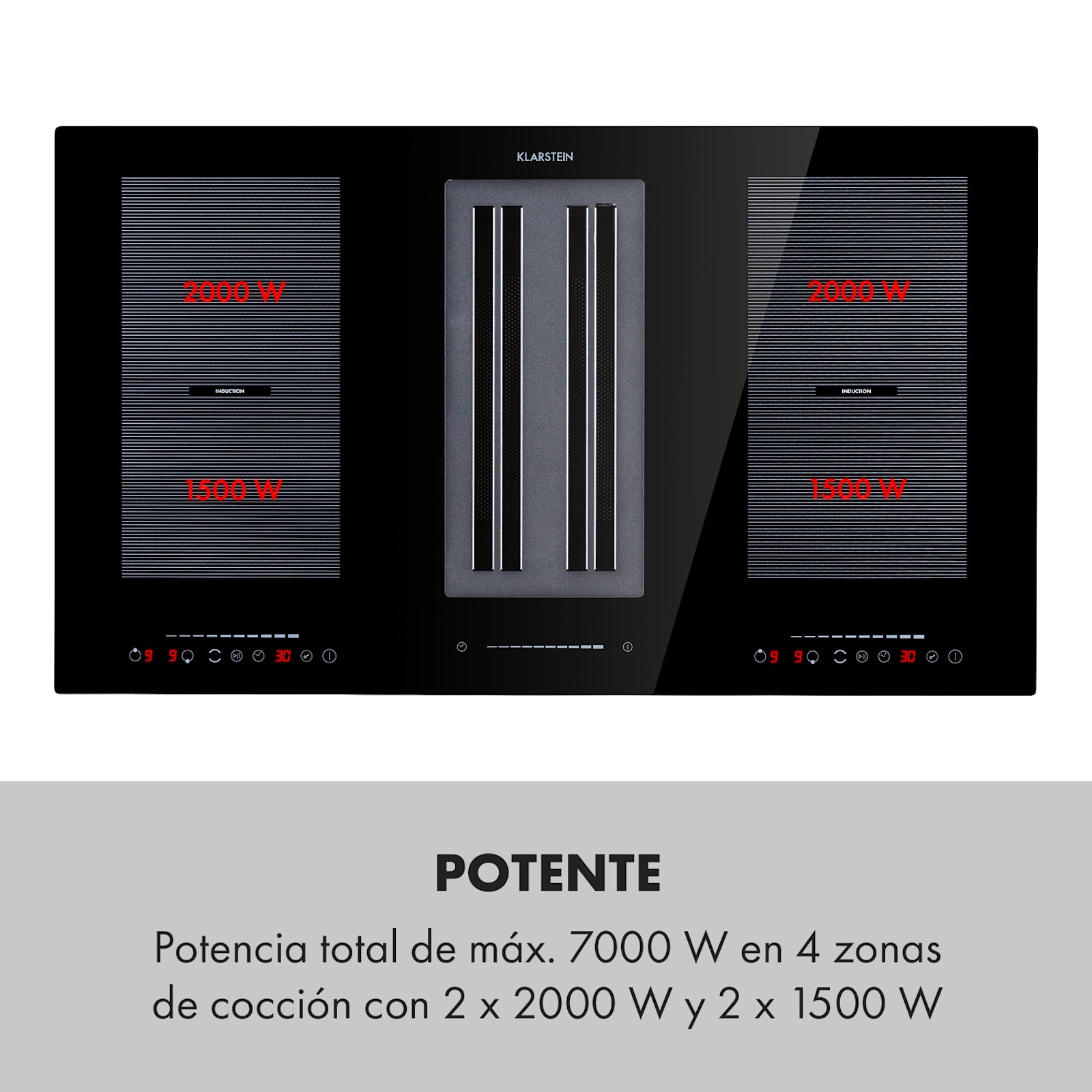 La potente placa de inducción del Sistema DownAir Full House 2.0 de Klarstein dispone de cuatro superficies de cocción para pequeños y grandes apetitos. Cada una de las dos superficies de cocción se encuentra a la izquierda y a la derecha de la abertura de entrada de la campana DownAir y, gracias al sistema VarioHeating, pueden conectarse de forma práctica para formar una gran zona flexible cada una, por ejemplo, para cacerolas u ollas grandes. Cada placa de cocción puede ajustarse a 9 niveles. La detección de ollas, la función de parada y arranque con ThermalRecall, la detección de calor residual, la función de temporizador y el bloqueo de seguridad para niños completan perfectamente la gama de usos de la placa de cocción.