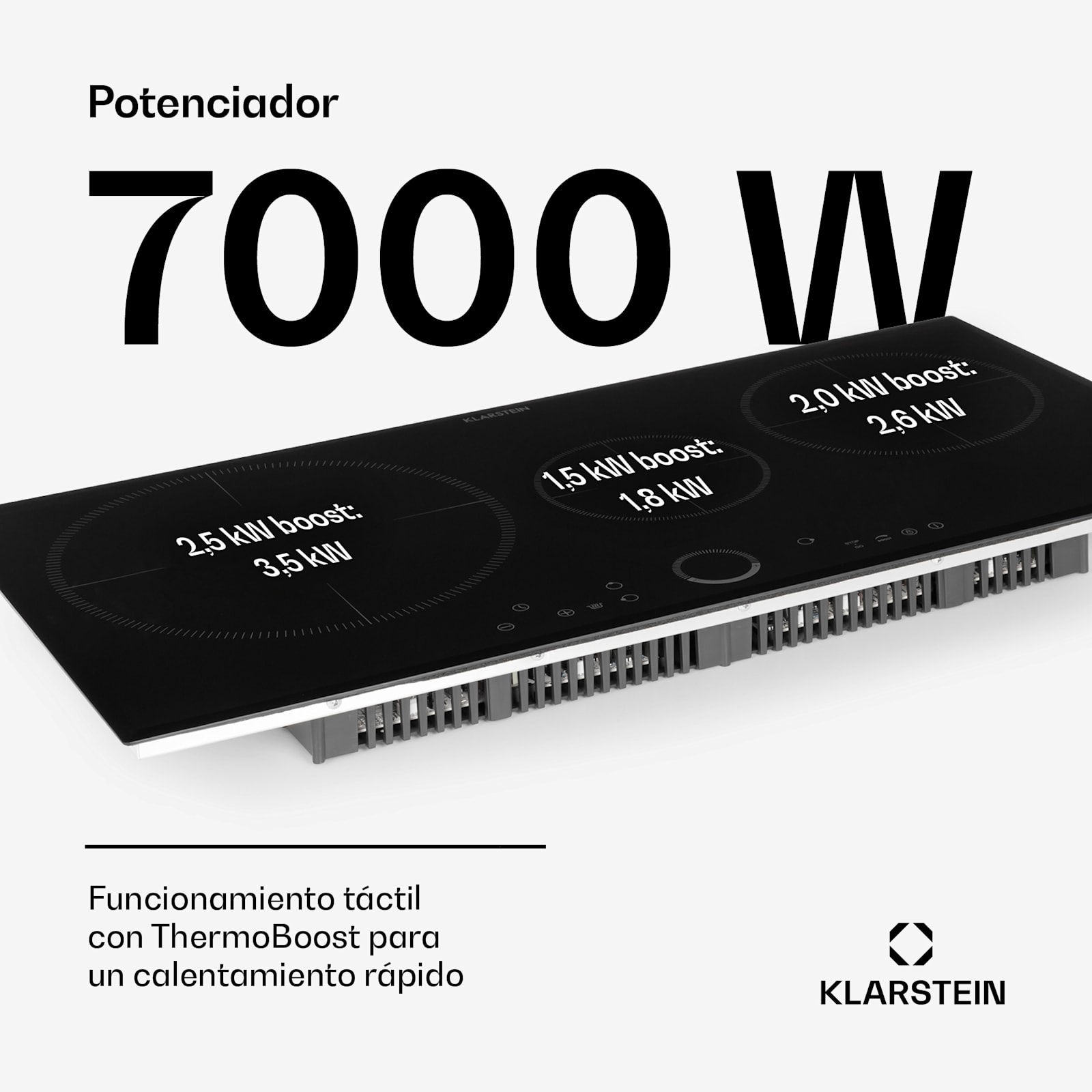• Calor potente: potencia total de 7400 W repartida entre 3 zonas de cocción de 2300 W, 2000 W y 1500 W