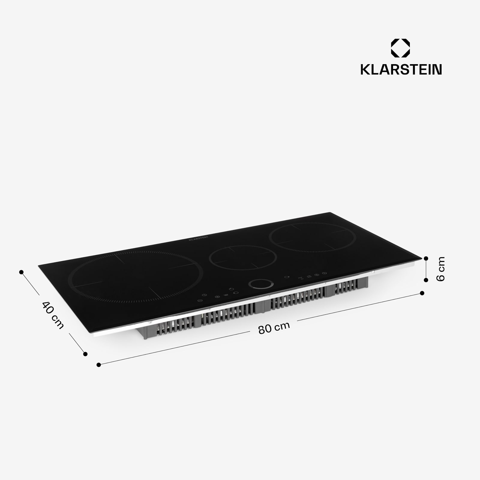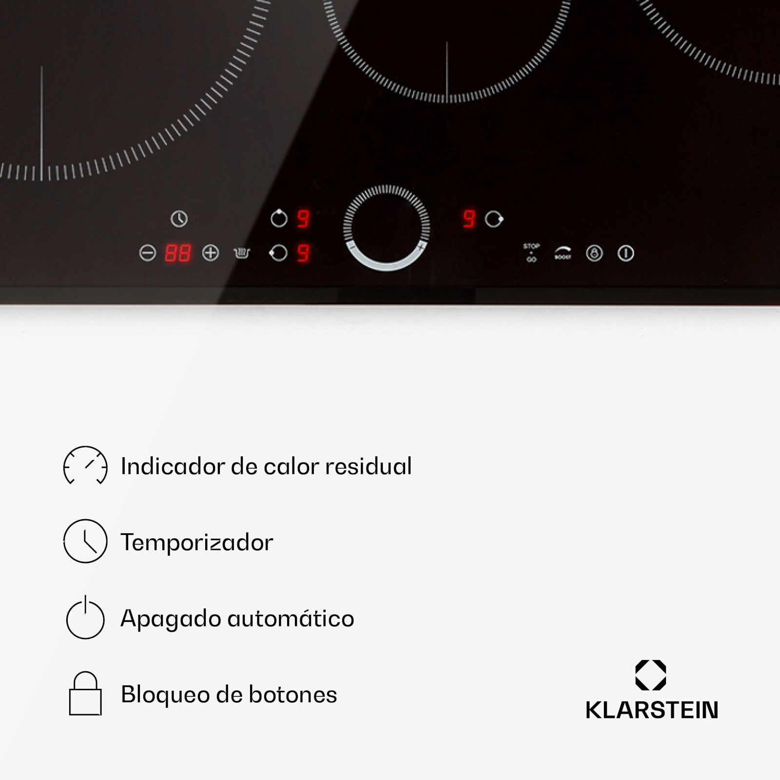 La placa de cocción integrada Delicatessa 80 de Klarstein dispone de 3 zonas de cocción con una potencia total de 7400 W 2300 W, 2000 W y 1500 W), para cocinar en tiempo récord el contenido de las ollas y sartenes. La zona de cocción izquierda es sumamente grande, con un diámetro de 30 cm, ideal para paellas u ollas, por ejemplo. Todas las zonas se regulan por separado y cuentan con una función ThermoBoost, que permite calentar rápidamente el recipiente con una potencia de 3000 W. La placa de vitrocerámica Delicatessa 80 de Klarstein se controla fácilmente a través del panel táctil SenseControl con el regulador Touch-to-slide y una pantalla digital. Así, no hay botones ni perillas en la superficie de la encimera. Además de la potencia, se puede programar para cada zona de cocción un temporizador de hasta 99 minutos que apaga la zona una vez transcurrido el tiempo establecido o emite una señal acústica.