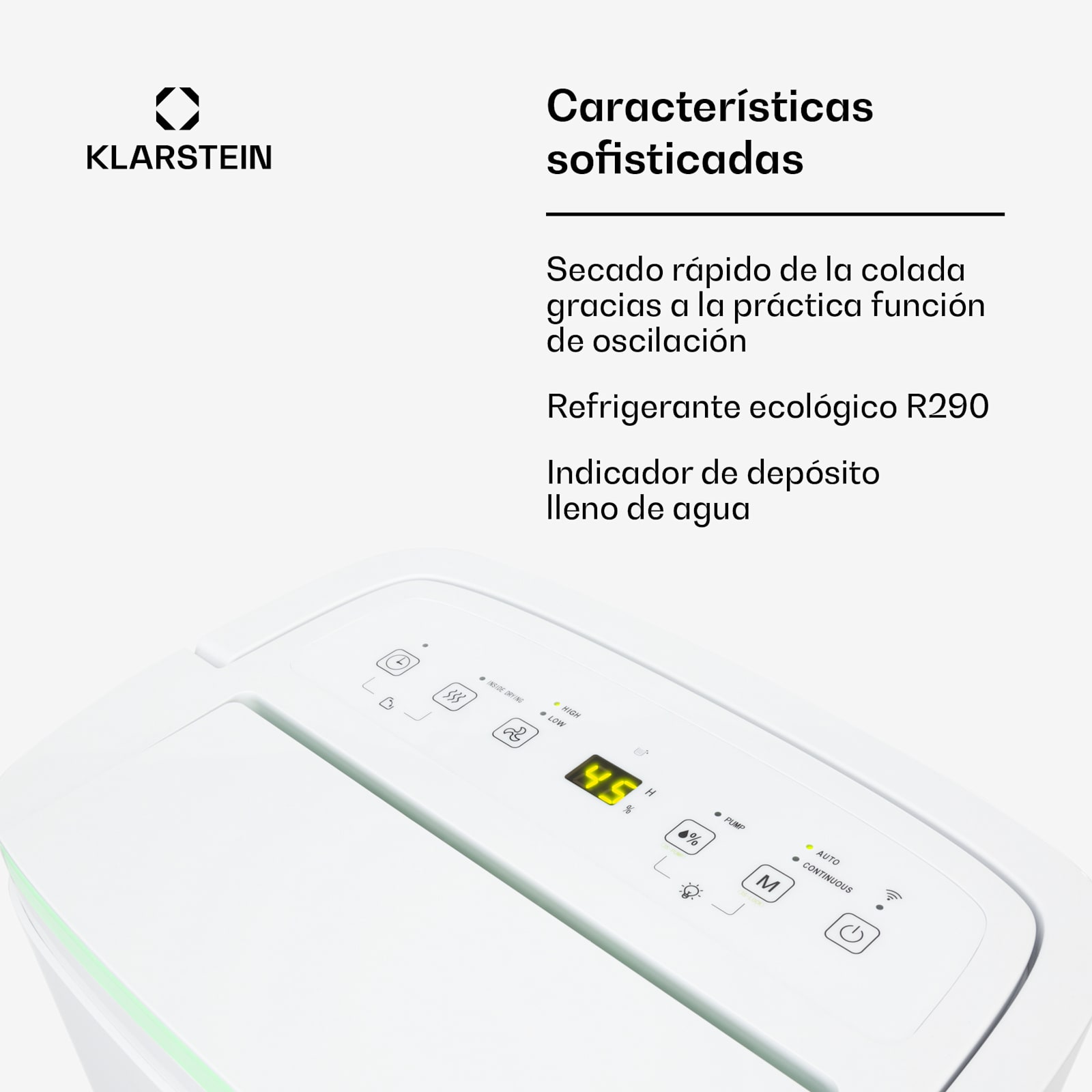 Con la humedad adecuada aumenta el bienestar: el deshumidificador DryFy Connect 50 de Klarstein elimina la humedad en un santiamén y asegura un aire óptimo en cocinas, lavabos y dormitorios, así como un secado rápido después de obras y renovaciones. Con una circulación de aire de 360 m³/h, absorbe hasta 50 litros de agua del aire por día. De este modo, el deshumidificador DryFy Connect 50 de Klarstein es ideal para espacios de 45 a 55 m². Un gran depósito de agua de 5 litros recoge el agua absorbida y, gracias a la función de alarma y al apagado automático cuando está lleno, puede vaciarse en el momento correcto. La interfaz Wi-Fi permite conectar el aparato a la red doméstica de internet y controlar el deshumidificador mediante la aplicación de Klarstein. Por si fuera poco, el DryFy Connect 50 de Klarstein integra un filtro de carbón activo que limpia el deshumidificador y elimina el polvo, los olores, las partículas de suciedad pequeñas e incluso los gérmenes del aire para que siempre disfrutes de un ambiente perfecto. Muy práctico también es el manejo del aparato: el DryFy Connect 50 se controla mediante los botones presentes en la pantalla ubicada en la parte superior. De este modo, puedes elegir la humedad meta deseada y programar el temporizador.