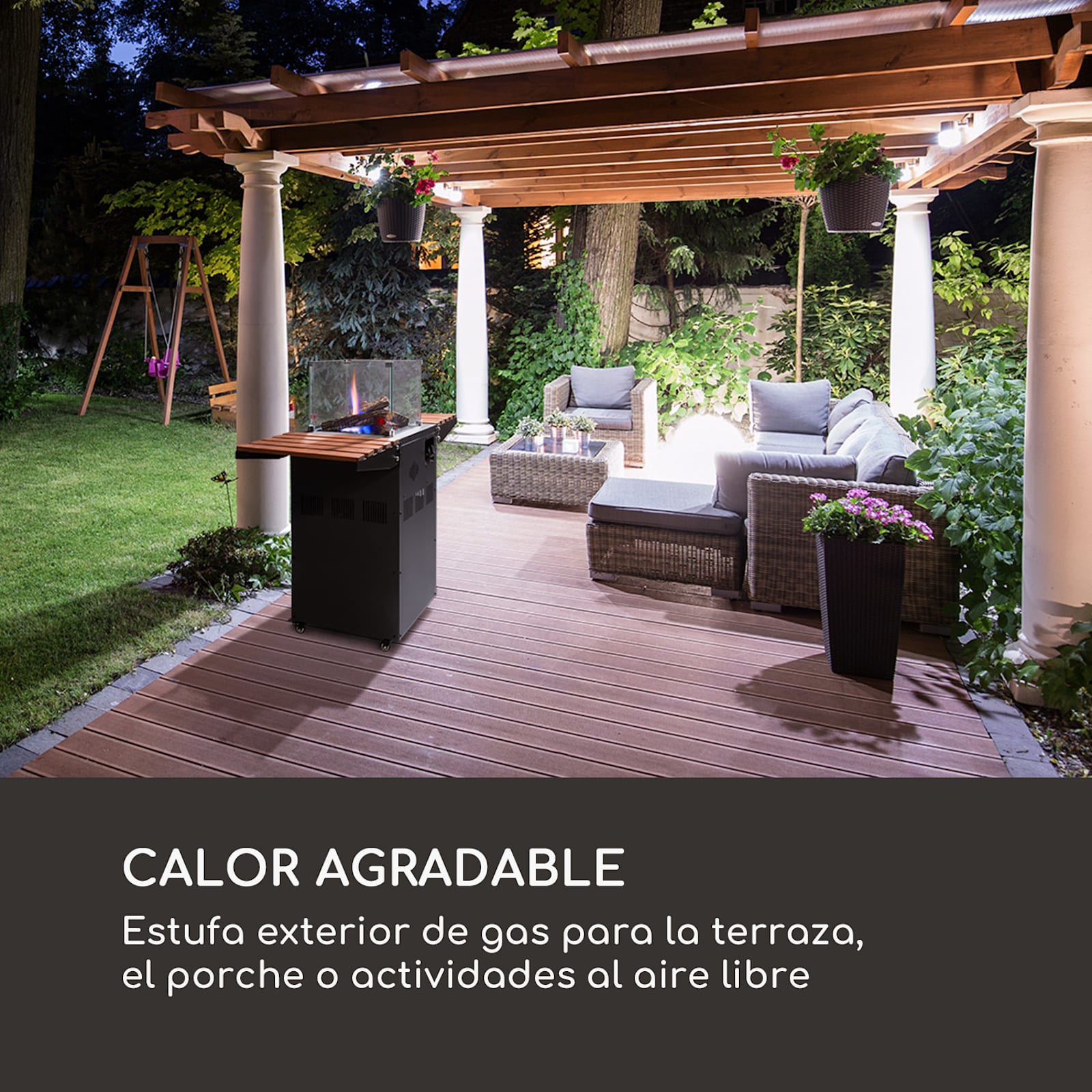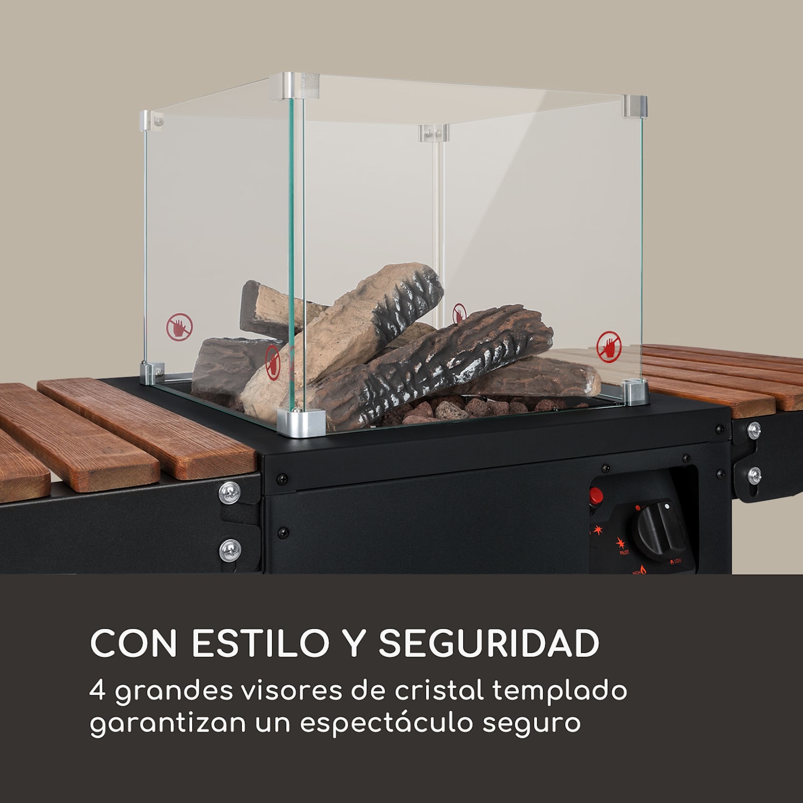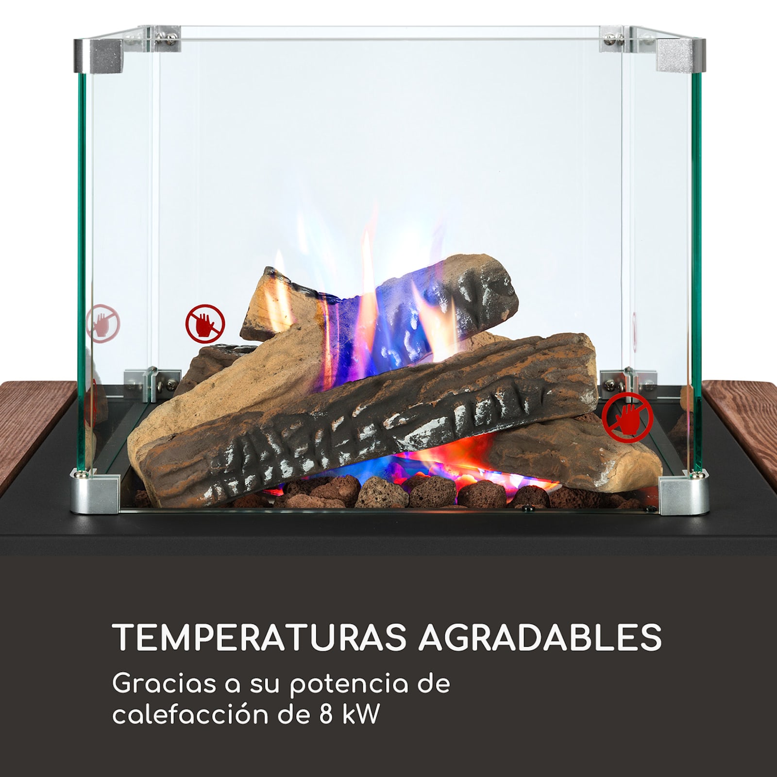 Potente y energéticamente eficiente: la estufa radiante de gas Flagranti Plus de blumfeldt es apto para el uso de bombonas de gas propano o butano de hasta 13 kg, que pueden guardarse fácilmente en el espacioso interior. El dispositivo se enciende fácilmente mediante el sistema de encendido eléctrico integrado. El suministro de gas se regula con un regulador de varias etapas y una manguera suministrada con reductor de presión. La calefacción de gas genera hasta 8 kW de potencia calorífica y proporciona al lugar de instalación y a las personas de las inmediaciones un calor agradable de forma rápida y eficaz. A ambos lados del Flagranti Plus hay unas prácticas mesas auxiliares de madera, que se pueden plegar y desplegar fácilmente y que son excelentes para colocar los vasos. El centro de atención es, por supuesto, la brillante llama, que se puede ver a través de 4 grandes ventanas de visualización hechas de vidrio templado. La llama de gas está rodeada de una bonita decoración de piedra de lava y madera, lo que lo convierte en un espectáculo impresionante y seguro. Cuatro ruedas para el suelo facilitan el desplazamiento de la estufa radiante de gas Flagranti Plus de blumfeldt , mientras que los fiables frenos de bloqueo garantizan que la estufa de exterior esté siempre bien sujeta. La construcción de acero inoxidable resistente a la corrosión hace que el dispositivo sea especialmente duradero y adecuado para su instalación en exteriores. Un fusible integrado interrumpe el suministro de gas al quemador si éste amenaza con volcarse. Equipada de este modo, alarga la temporada de exterior unos meses más con un calor acogedor.