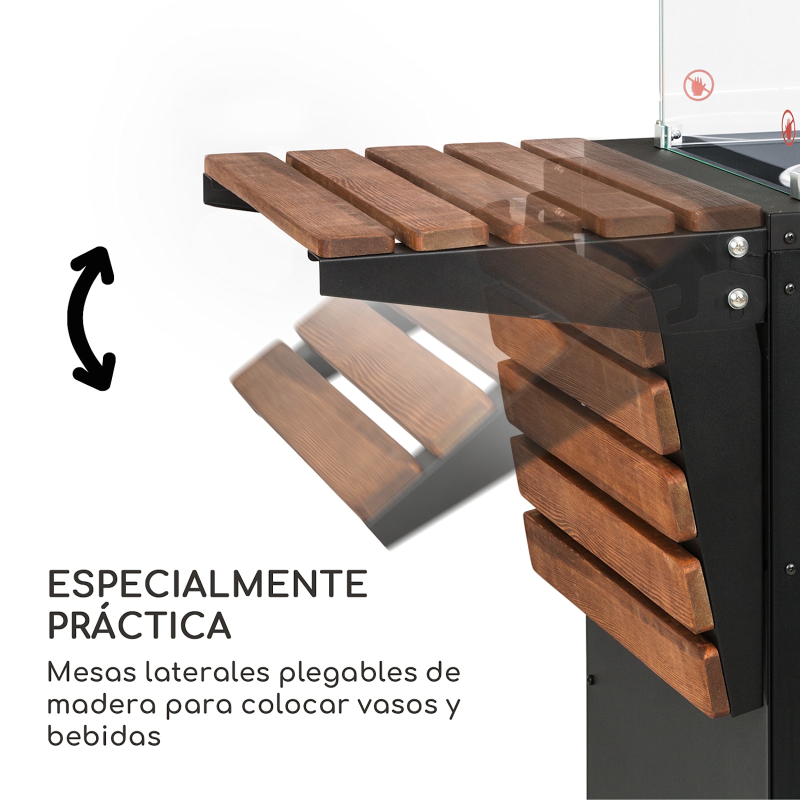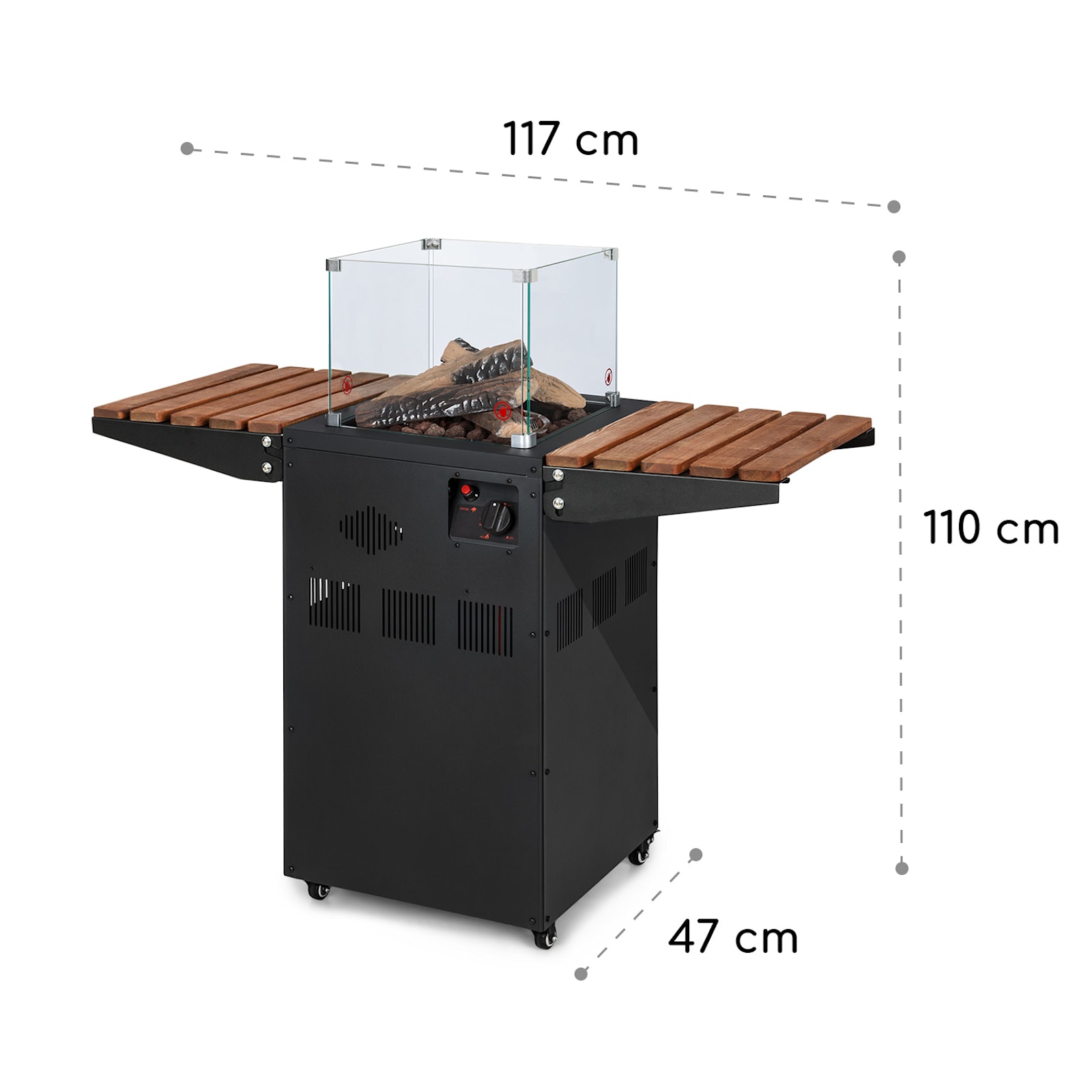 Disfrute de una reunión acogedora a una temperatura agradable en la terraza, el porche o durante las actividades al aire libre con la estufa radiante de gas Flagranti Plus de blumfeldt con mesas laterales plegables.