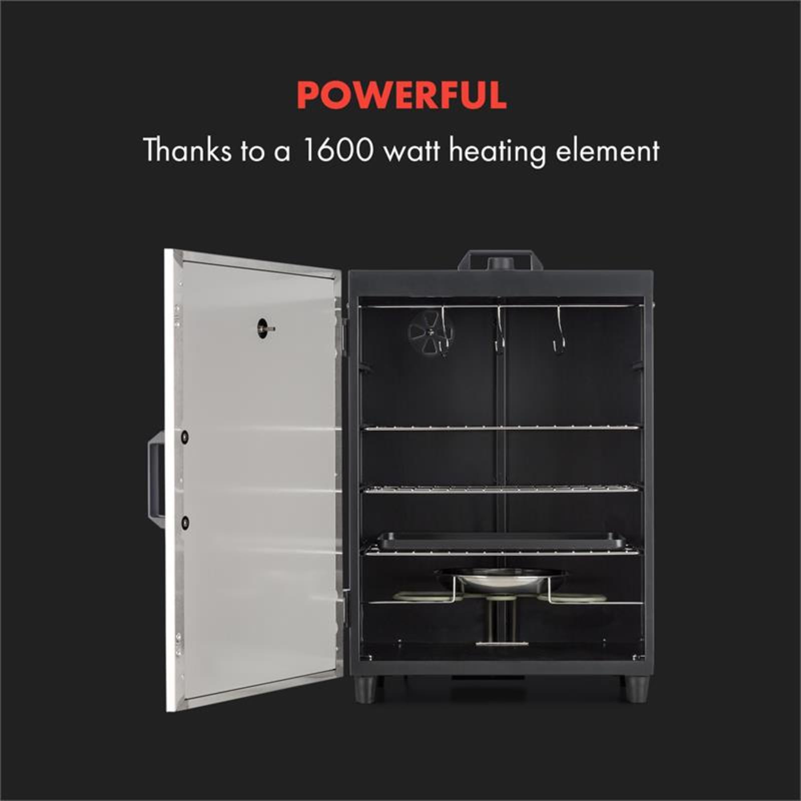 Descubra el arte tradicional del ahumado. Con el horno para ahumar Klarstein Flintstone Steel, le dará el sabor perfecto a una variedad de alimentos según sus deseos. Al mismo tiempo, la carne, el pescado o las salchichas se conservarán por mucho más tiempo. Con un dispositivo térmico eléctrico de 1.600 vatios y un termostato regulable en la parte superior del electrodoméstico, el horno calienta las astillas de madera al tiempo que los alimentos se cuecen muy lentamente hasta la perfección. Las tres rejillas cromadas para ahumar de 40 x 25 cm respectivamente tienen mucho espacio para tocino, trozos de tofu o embutidos propios mientras los tres ganchos brindan más espacio para colgar salchichas o jamón. Una cubeta de goteo extraíble atrapa agua condensada y la grasa que gotea y facilita la limpieza posterior. En el horno para ahumar Klarstein Flintstone Steel, la densidad del humo se controla cómodamente gracias a la válvula de ventilación trasera. Un termómetro incorporado de hasta 300 °C facilita el control de la temperatura de ahumado. En la bandeja extraíble de acero inoxidable, las astillas y las sales de ahumar se transforman en un humo delicioso directamente sobre el dispositivo térmico. Gracias a su construcción liviana y el asa para transportar de la parte superior, el horno para ahumar se puede desplazar sin esfuerzo.