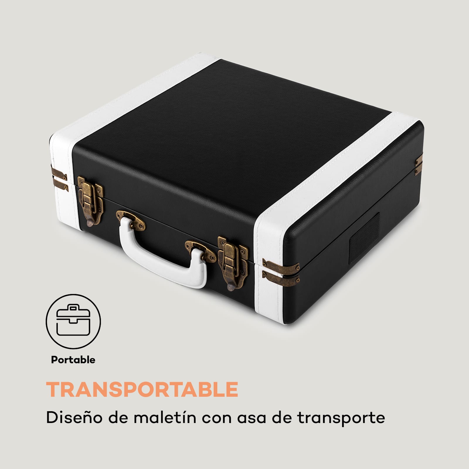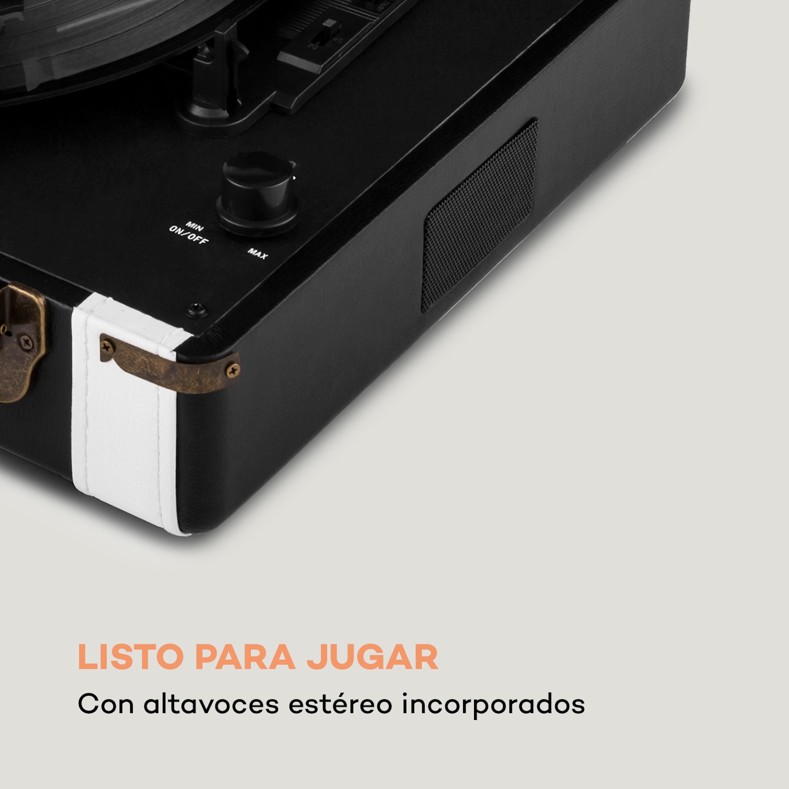 El tocadiscos Jerry Lee de Auna no requiere de altavoces adicionales, ya que en su elegante carcasa maleta ya posee dos altavoces estéreo integrados. Sin embargo, la salida RCA posterior proporciona la capacidad de conectar altavoces externos si se prefiere. El volumen se puede ajustar de forma continua directamente en el dispositivo a través de una perilla.