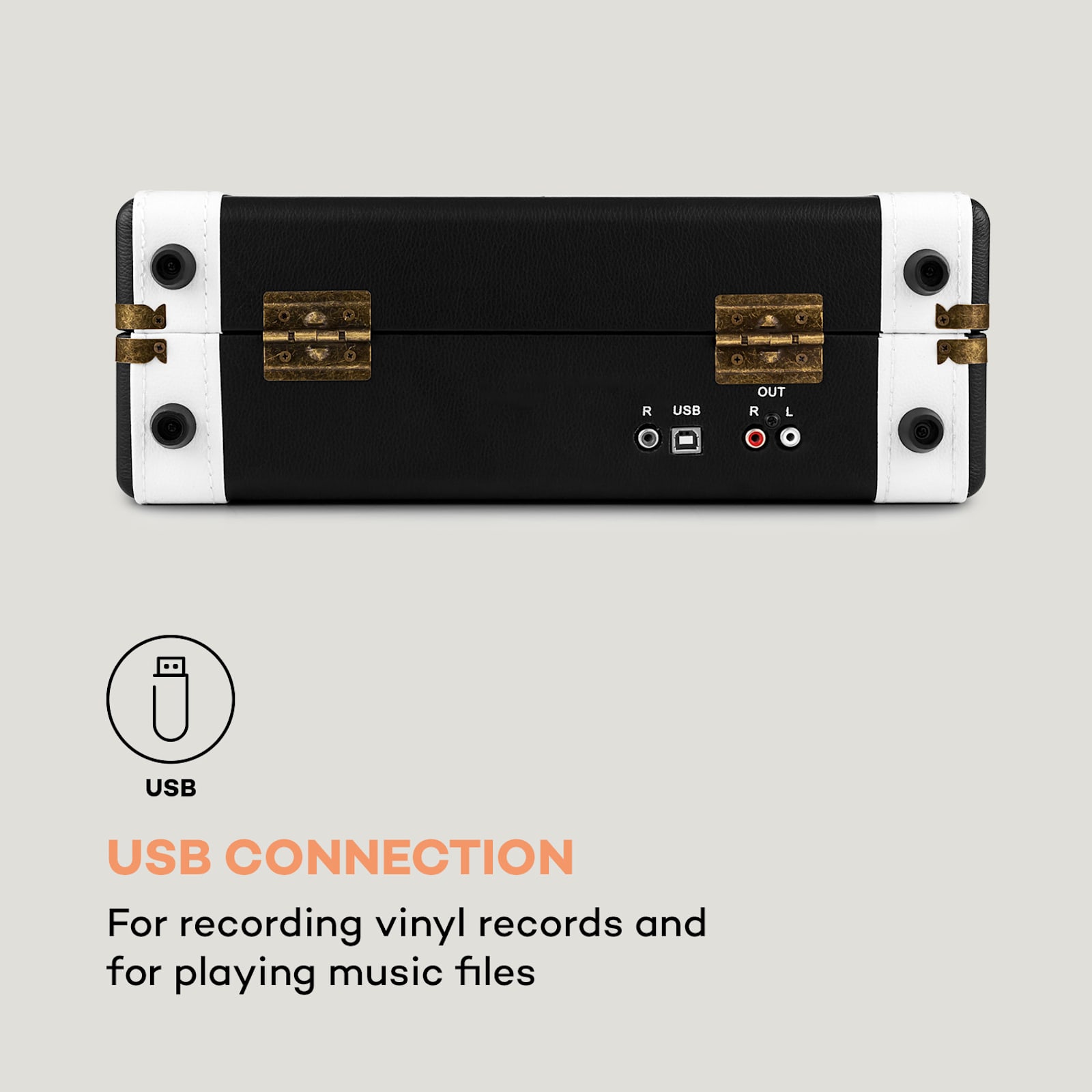 Gracias a su puerto USB trasero mediante el cualtransmite fácilmente la señal de LP al ordenador, y al mismo tiempo el tocadiscos Jerry Lee se reproduce con la corriente del mismo. Se suministra un cable USB y un adaptador adecuado para conectar a la alimentación de corriente.