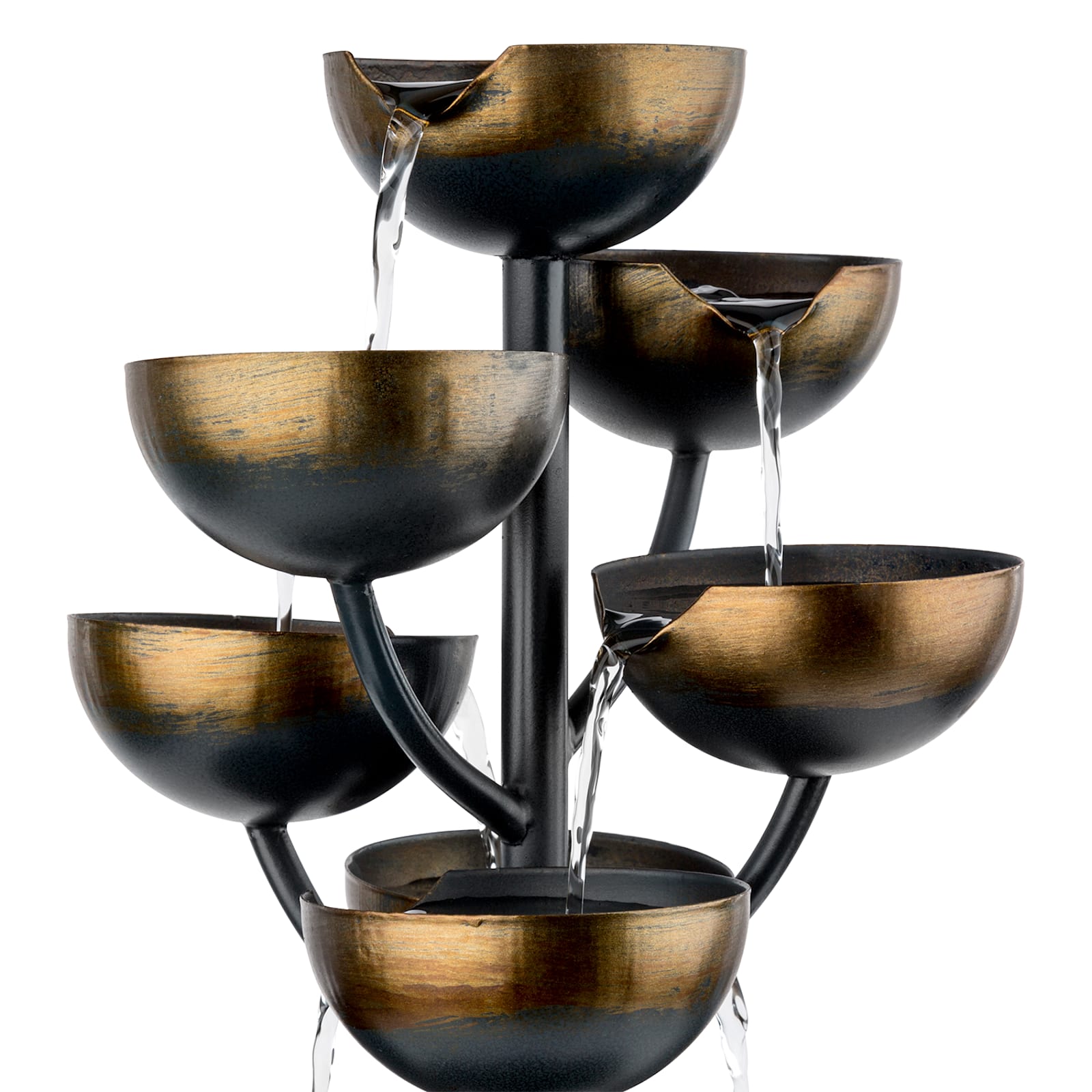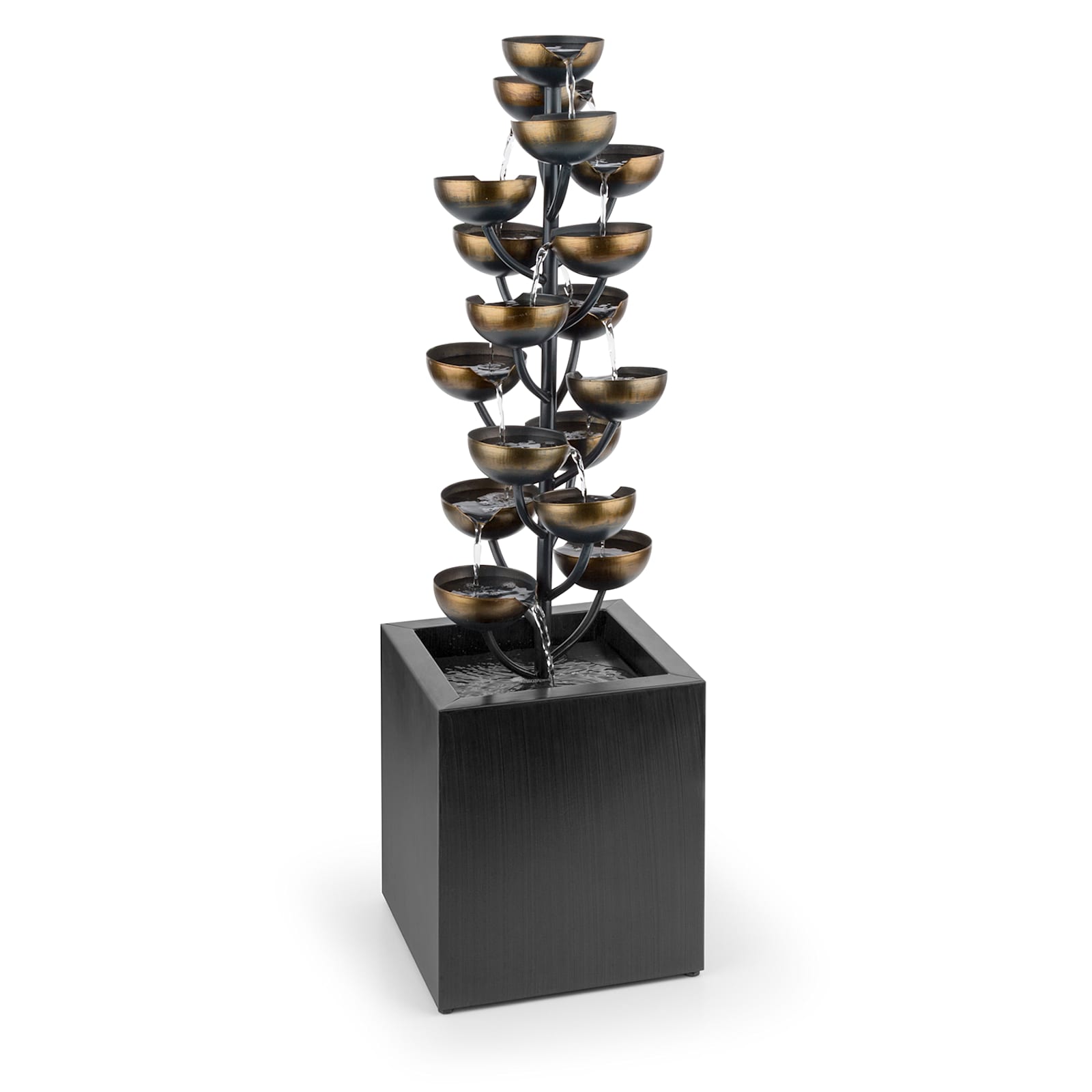 No hay una manera más bonita de relajarse que escuchando el suave murmullo del agua de la fuente ornamental Joshua Tree de Blumfeldt. La refrescante agua desemboca desde lo alto del árbol en 17 recipientes y alegra el ánimo de forma visual y acústica. La Joshua Tree presenta una construcción robusta, pues está hecha de metal resistente a la intemperie que no sólo tiene un aspecto de notable parecido a latón que no se desluce sino también se adapta perfectamente a cualquier entorno. La potente bomba de 7 W mantiene la cascada en un funcionamiento continuo para que ésta nunca termine. El suave murmullo despliega un efecto relajante y convierte el entorno del árbol en un oasis de relax.