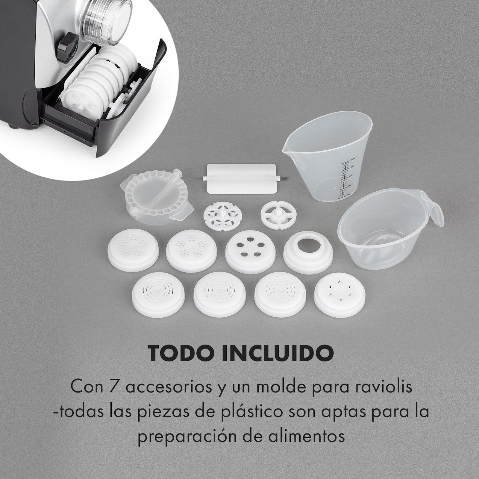 El motor de la Pastamania trabaja con una potencia de 260 W y, con un ruido de funcionamiento de 60 dB, es particularmente silencioso. En el interior del aparato inteligente se pueden amasar hasta 500 g de harina en tan solo 3 minutos y, al cabo de 10 minutos, la harina está lista para ser sumergida en agua hirviendo. Los 7 accesorios transforman la masa lisa en las más bellas creaciones de pasta, que se complementan con el molde de raviolis suministrado. El aparato funciona de forma completamente automática, a excepción de la adición de 1, 2 o 3 posibles tazas dosificadoras llenas de harina y la correspondiente cantidad de agua. Todos los ajustes se realizan cómodamente pulsando los 5 botones de funcionamiento y se leen a través de la pantalla led. Todas las piezas de plástico utilizadas son aptas para el procesamiento de alimentos y pueden lavarse y limpiarse fácilmente después de su uso.