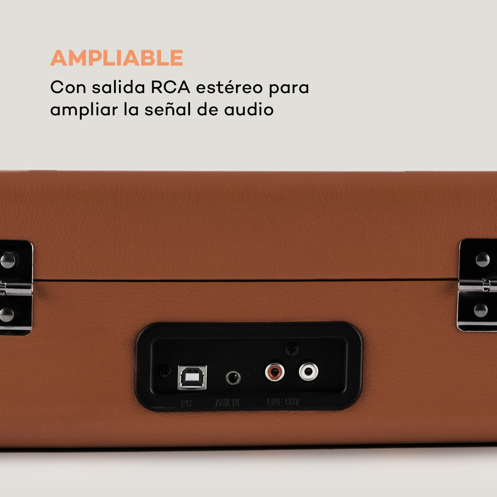 El tocadiscos Peggy Sue de Auna no requiere de altavoces adicionales, ya que en su elegante carcasa de maleta ya posee dos altavoces estéreo integrados. Sin embargo, la salida RCA posterior proporciona la capacidad de conectar altavoces externos si se prefiere. El volumen se puede ajustar de forma continua directamente en el dispositivo a través de una perilla.