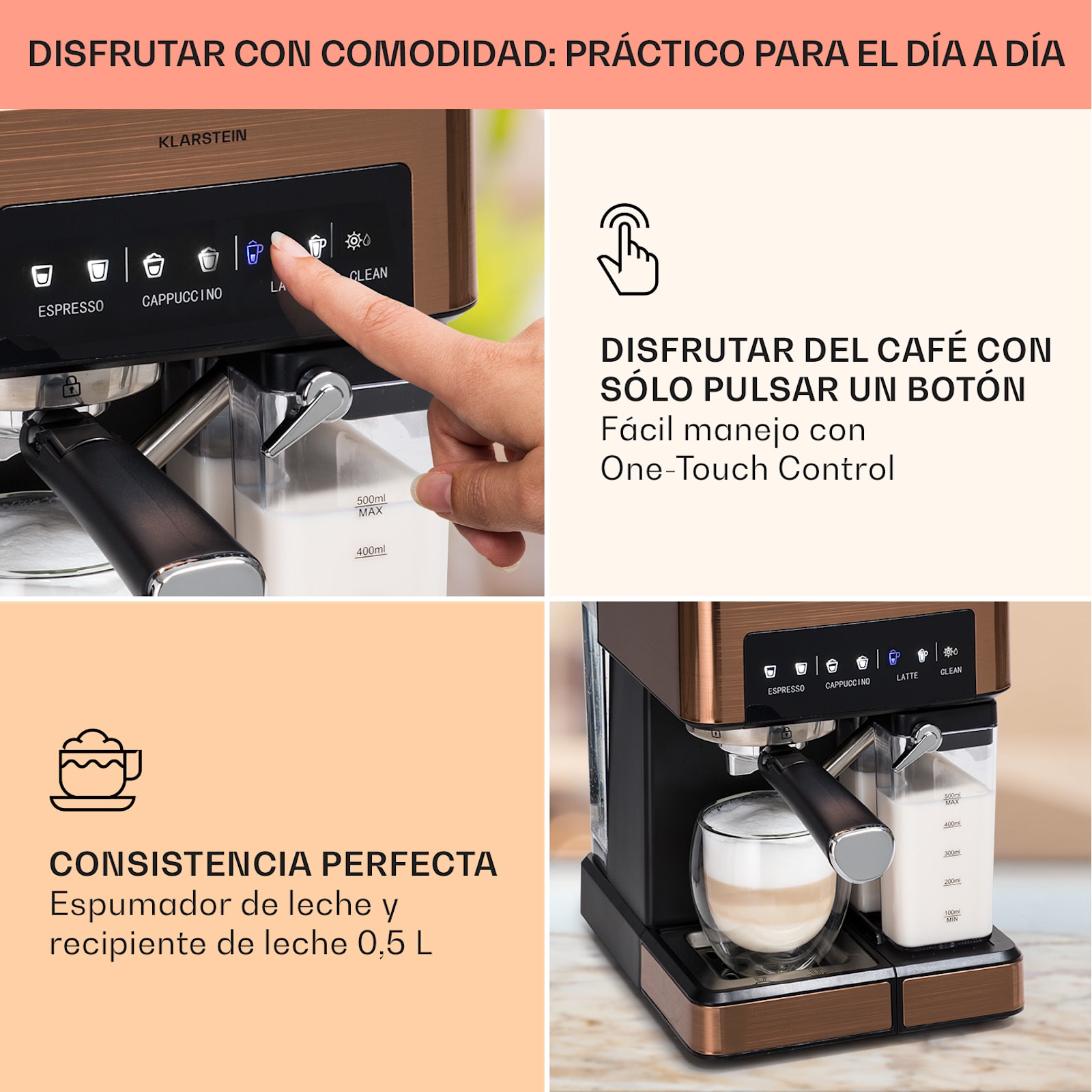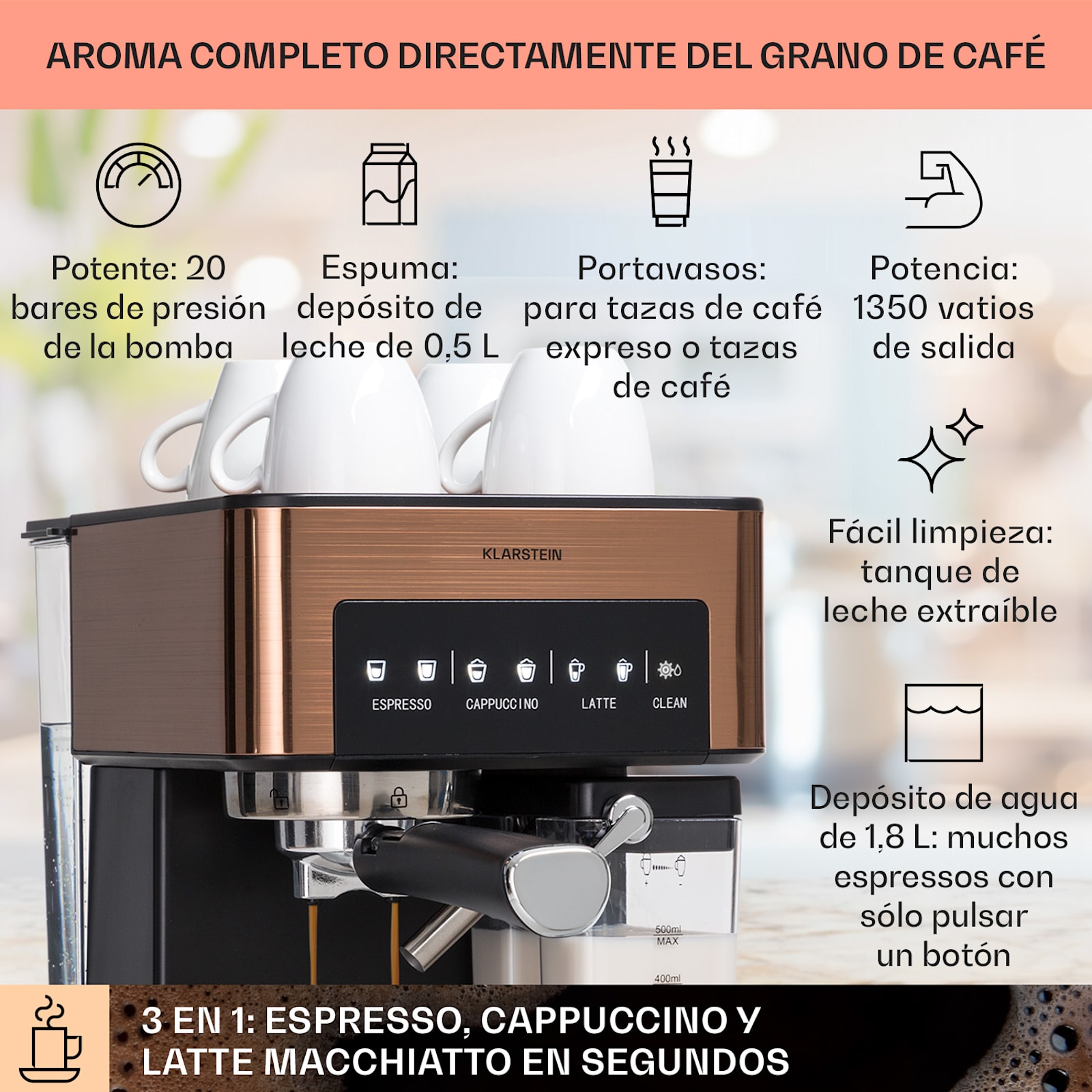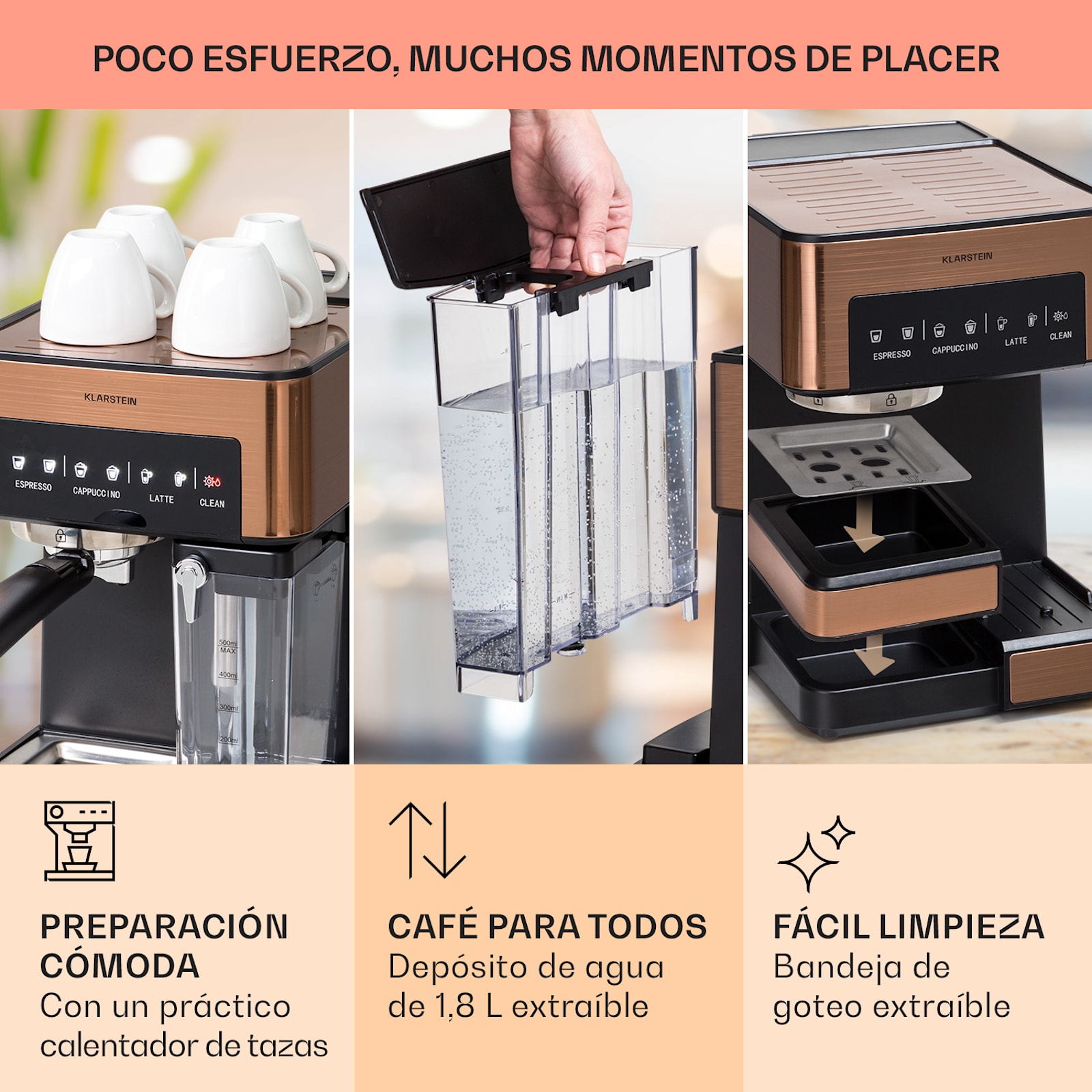 Para los apasionados del café: deje que la máquina de café espresso Klarstein Arabica Comfort le convenza con un delicioso espresso, cappuccino y latte macchiato con tan sólo pulsar un botón. Gracias a la boquilla espumadora de acero inoxidable de 90° y al depósito de leche extraíble, podrá regular la producción de espuma de leche de forma individual en cualquier momento. Además, para preparar el café puede utilizar café molido o un práctico pad de café. Incluso la limpieza es fácil gracias al depósito de agua extraíble de 1,8 litros y a la rejilla de goteo lavable.