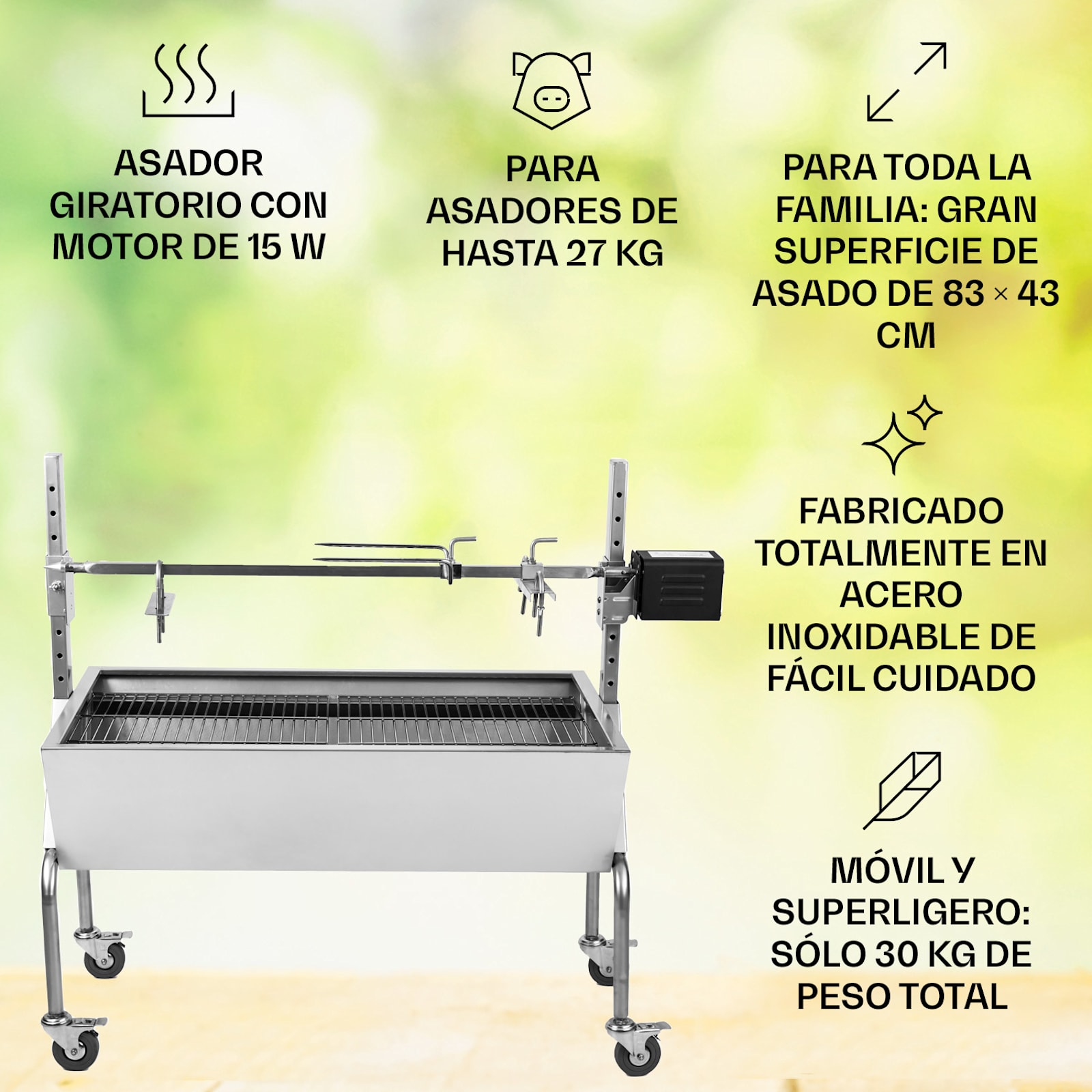 Un construcción estable de acero determina la apariencia externa del aparato. Gracias a sus cuatro ruedas con frenos integrados, y a pesar de su peso de 30 kg y su elevada estabilidad, la amplia parrilla para lechón se puede mover con facilidad de un lugar a otro: del garaje al jardín o del cobertizo a la terraza.
