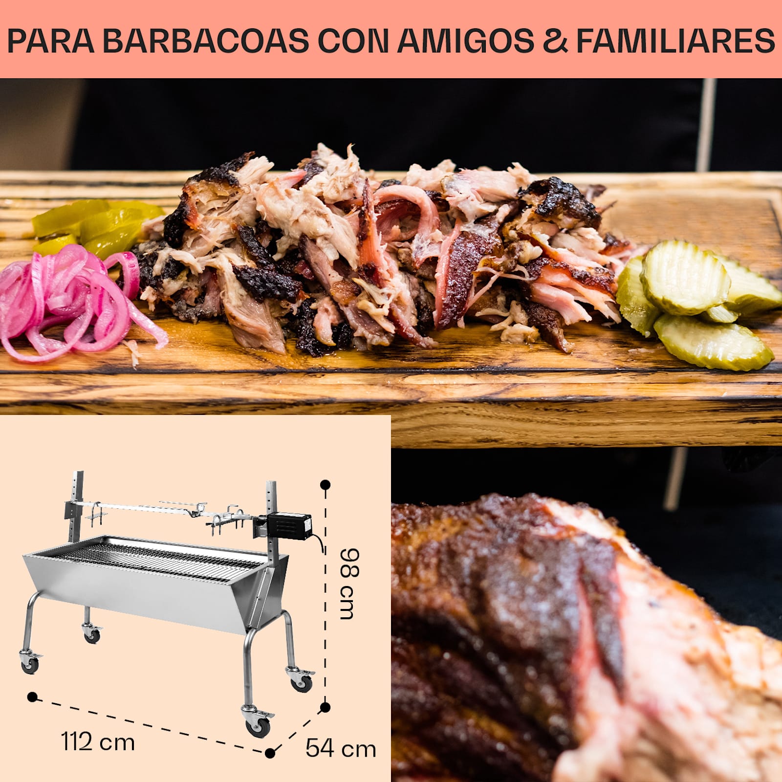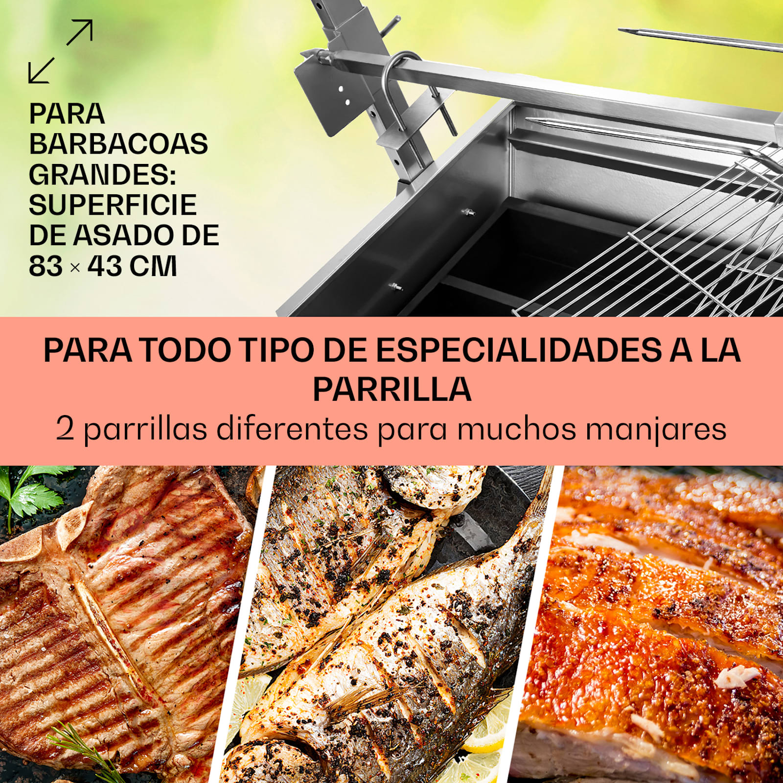 Un gran atractivo de la parrilla es su asador de acero inoxidable y de tamaño equilibrado: en él se pueden espetar deliciosas carnes para asar, como pollos u otros alimentos. Las sujeciones incluidas en el envío permiten una fijación fiable de piezas especialmente grandes, como corderos o cerdos enteros.