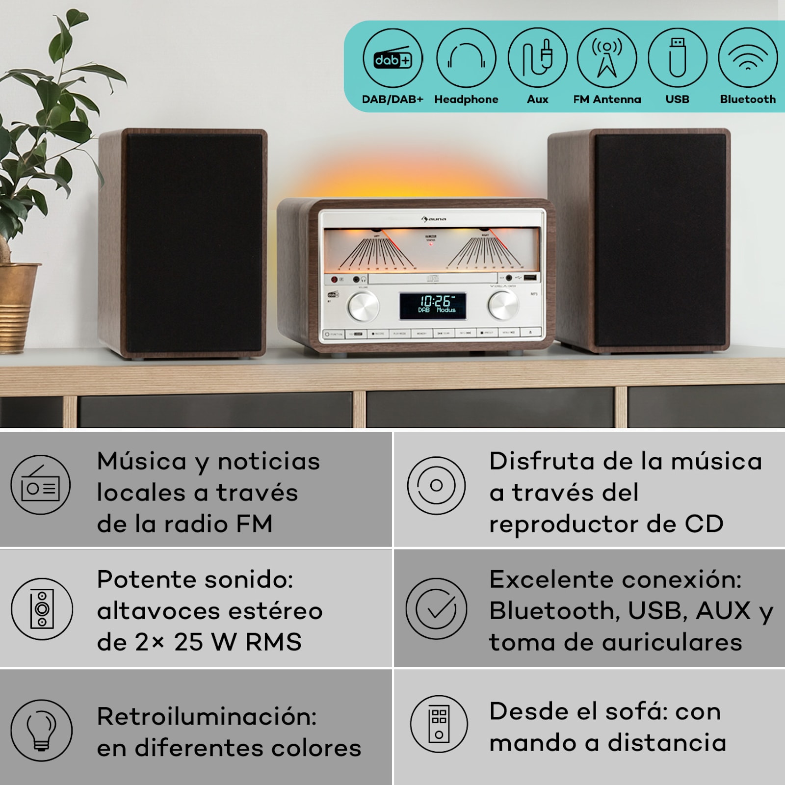 Este compacto multitalento domina tanto el lenguaje analógico como el digital para proporcionar acceso a innumerables emisoras de radio de las bandas de frecuencia DAB+ y FM. En consonancia, la función RDS ofrece contenidos adicionales que acompañan al programa, como artista, título, álbum o incluso noticias, que se muestran directamente en la pantalla LCD de 2,4″. Si, por el contrario, no te apetece escuchar la radio, el reproductor de CD de carga frontal, el puerto USB, la conexión Bluetooth y la entrada AUX dejan poco que desear en cuanto a reproductor multimedia. Y si aún faltan éxitos en tu colección, puedes grabarlos desde las fuentes de audio del Elton directamente en una memoria USB conectada. Los dos altavoces de 2 vías de 25 vatios RMS, que se pueden ajustar fácilmente gracias al vúmetro integrado, garantizan un sonido óptimo. Y si quieres deleitarte solo con los grandes éxitos de Elton, puedes utilizar la salida de auriculares de 3,5 mm. Gracias a una navegación por menús sencilla y clara, el manejo es muy fácil. Además, el Elton DAB puede controlarse cómodamente mediante el mando a distancia suministrado.