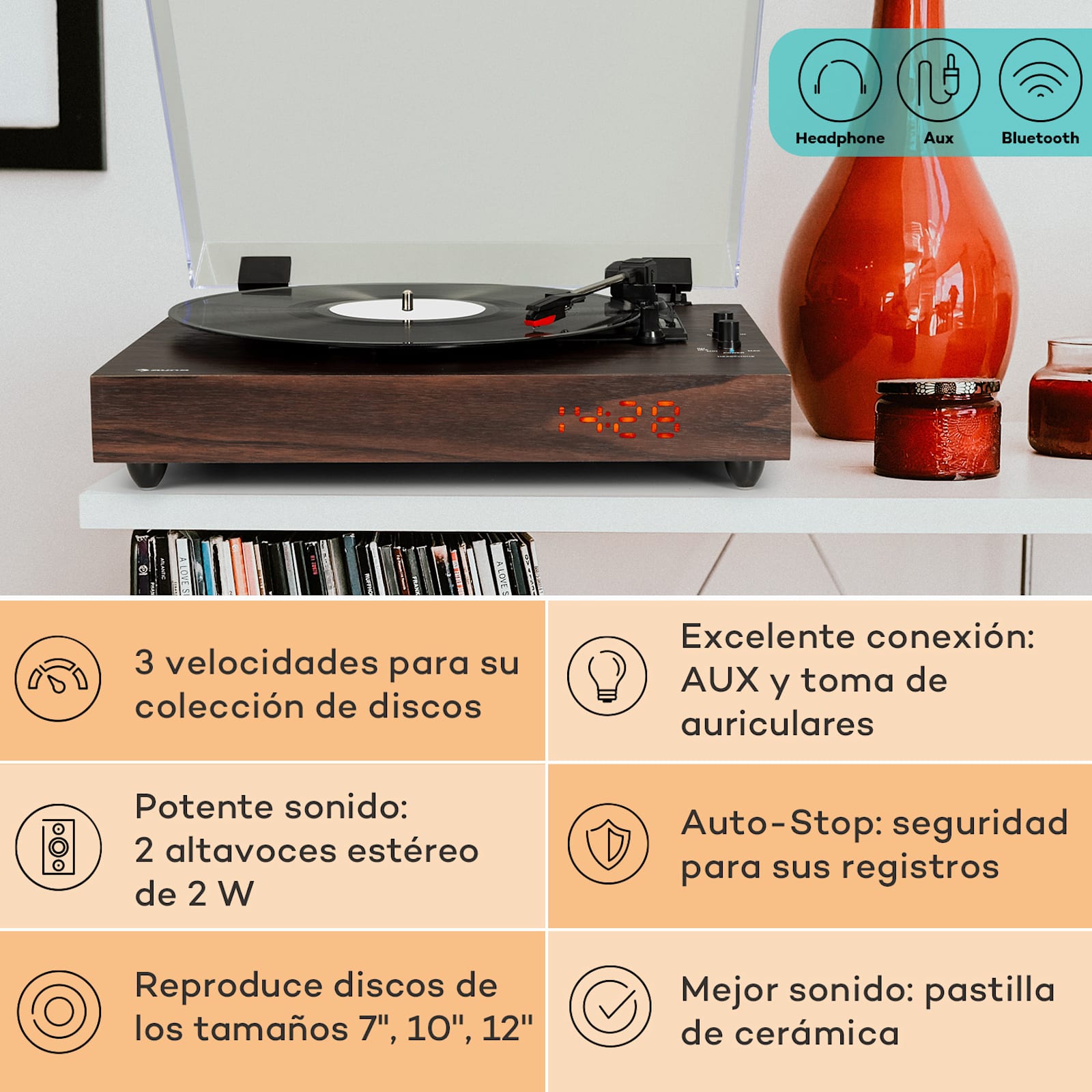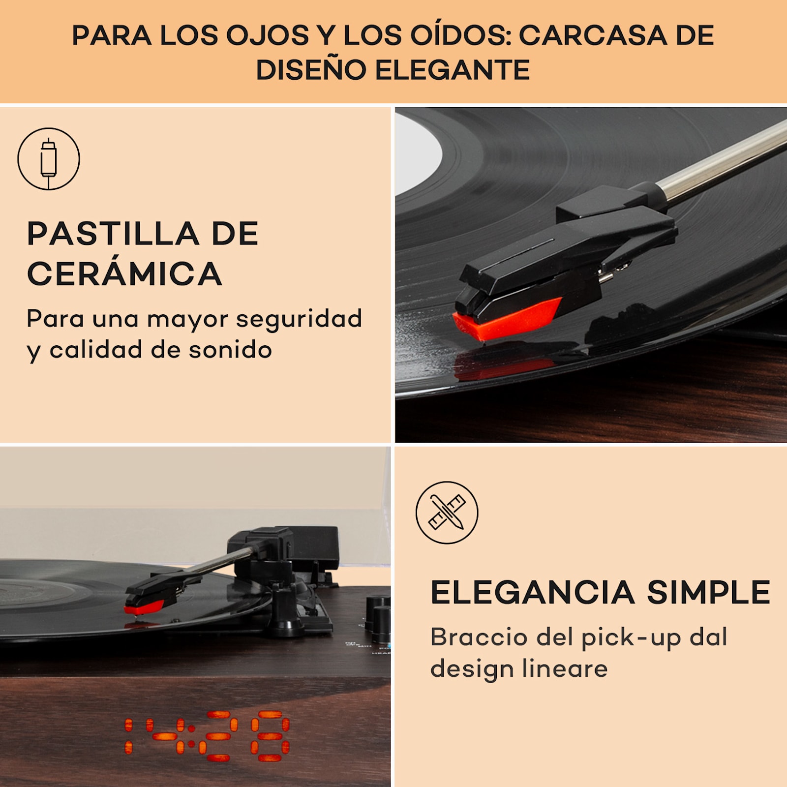 Experiencias musicales clásicas para entendidos: elegante, atractivo y con una imagen sonora inimitable, el tocadiscos TT-Classic Chrono de auna da vida y el mejor sonido de los discos de vinilo. Los altavoces estéreo integrados parecen casi invisibles y permiten empezar a utilizar el tocadiscos inmediatamente. Además de la clásica reproducción del sonido a través de la aguja, el TT-Classic Chrono de auna ofrece tecnologías de última generación que hacen que todo corazón musical lata más rápido. Como si viniera de lo invisible, un práctico reloj LED se ilumina en su cuerpo.