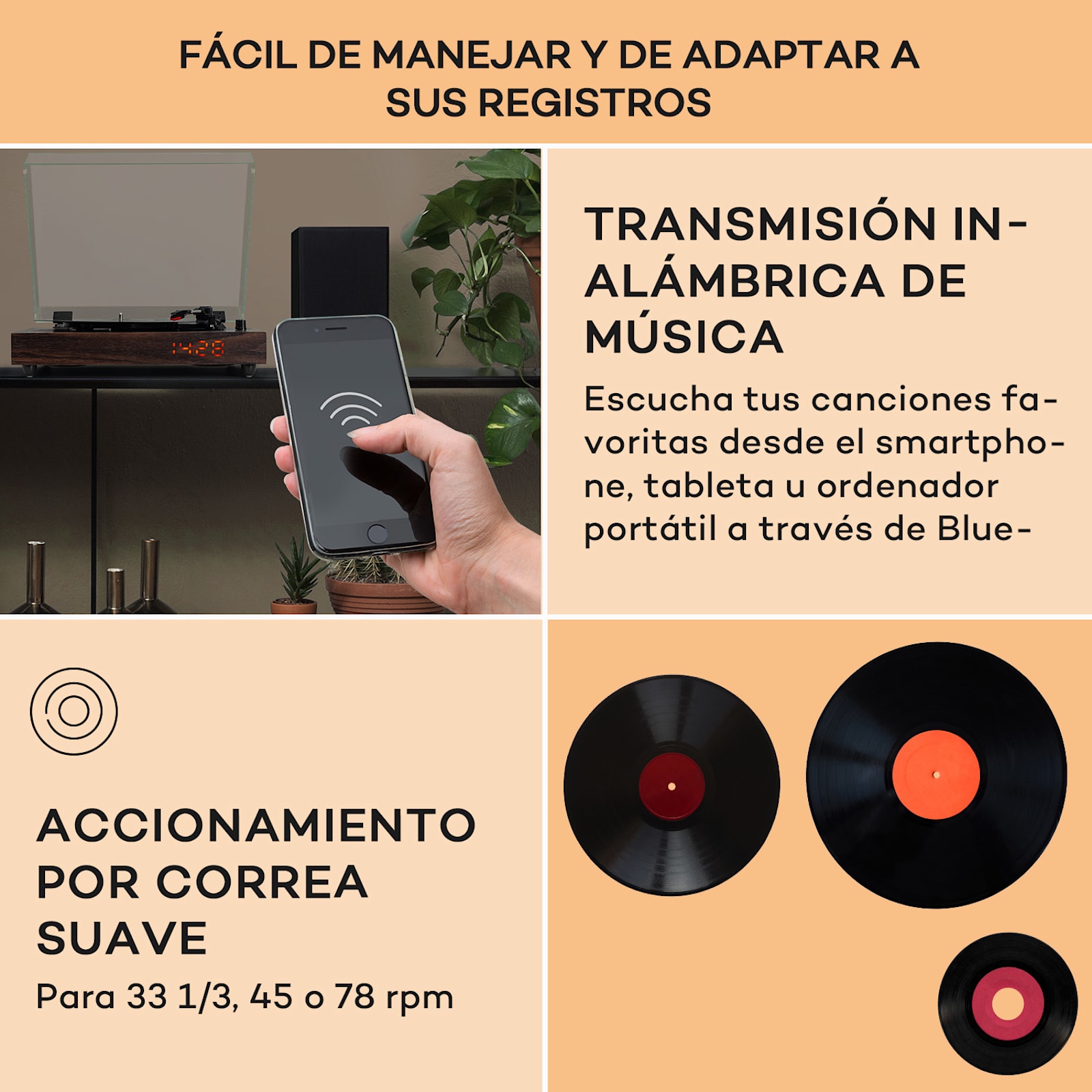 Reducido a lo esencial, el tocadiscos TT-Classic Chrono de auna impresiona por su sencillo funcionamiento y sus modernos componentes. Su suave transmisión por correa funciona a 33, 45 o 78 revoluciones por minuto y es adecuada para todos los discos estándar. Los altavoces estéreo integrados en el suelo garantizan el disfrute de la música sin necesidad de dispositivos adicionales. Además, se puede incluso conectar el tocadiscos de forma inalámbrica a otros altavoces o soportes de audio mediante el conector Bluetooth. También se proporciona una salida de línea RCA y una entrada AUX para integrar el TT-Classic Chrono en un conjunto de alta fidelidad más amplio.