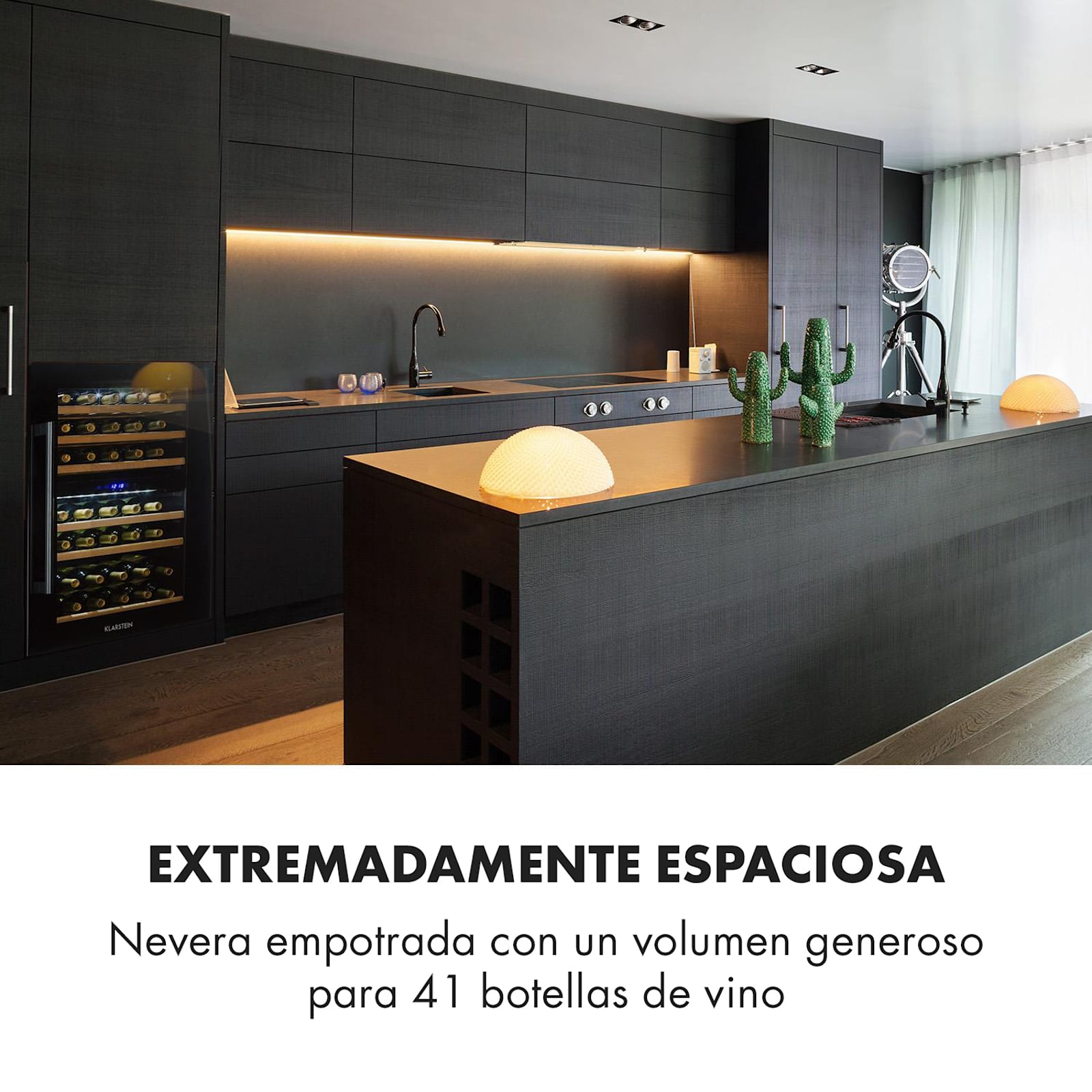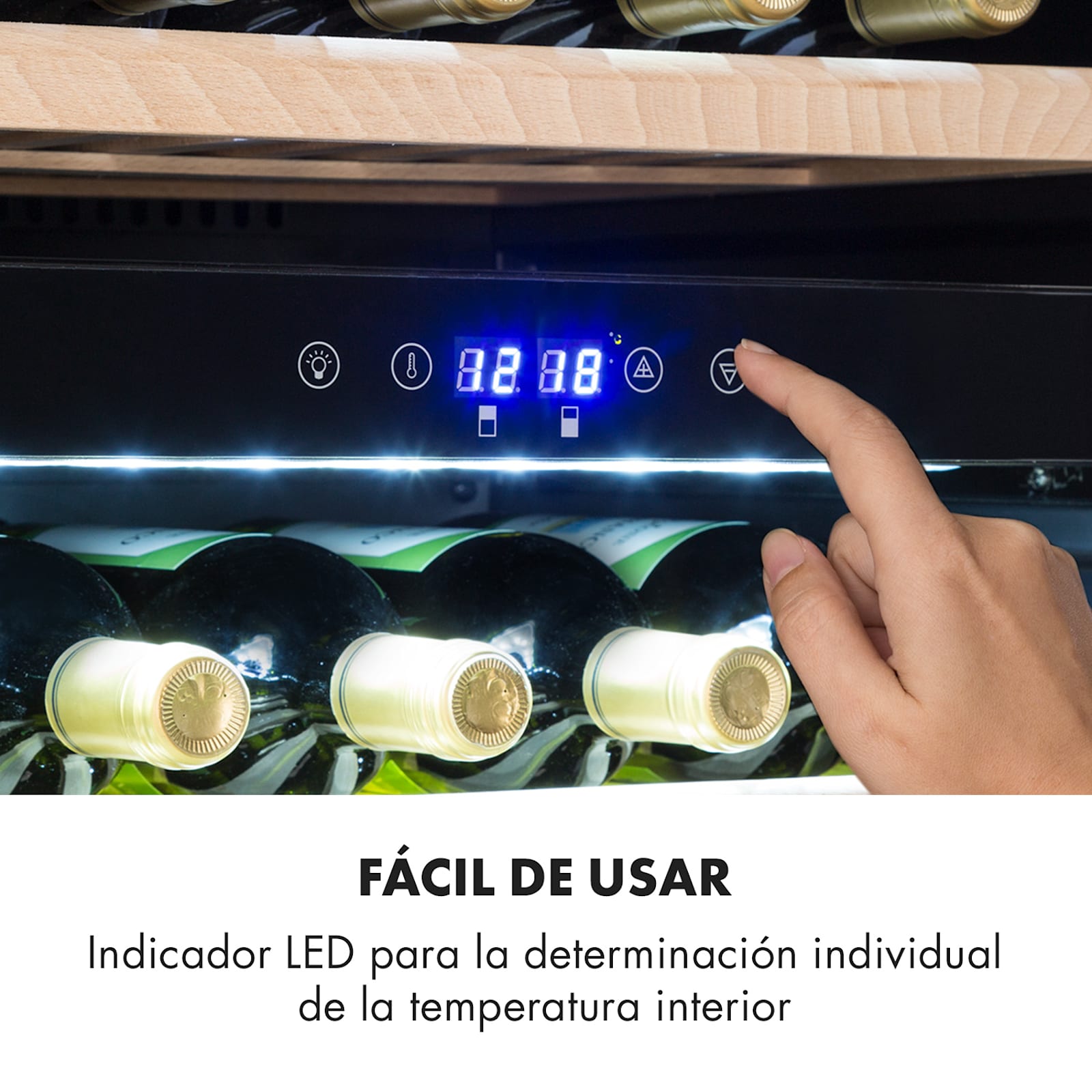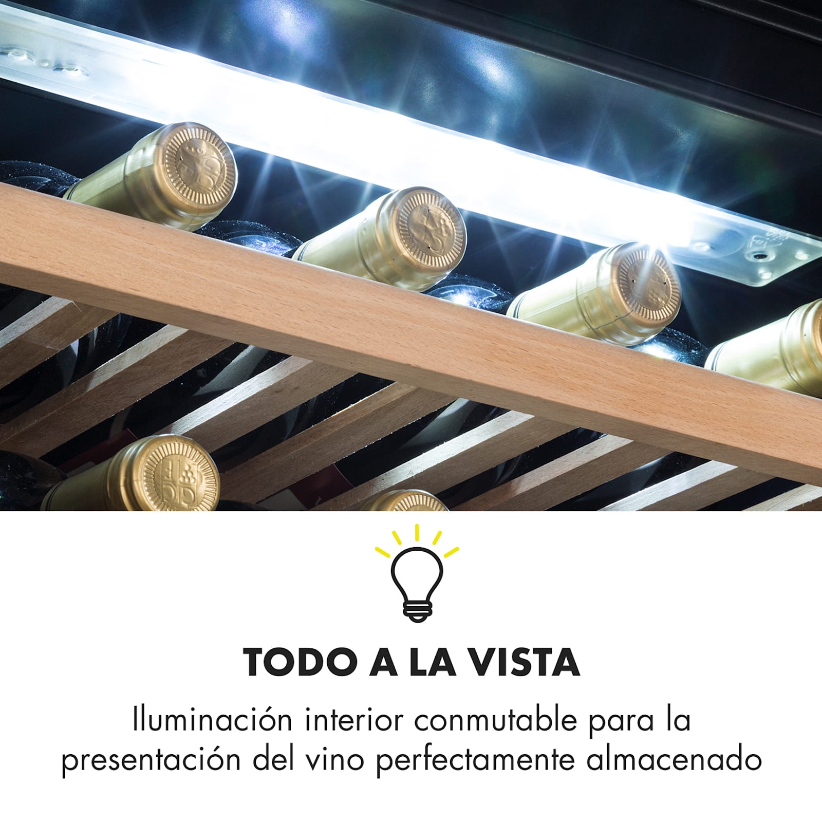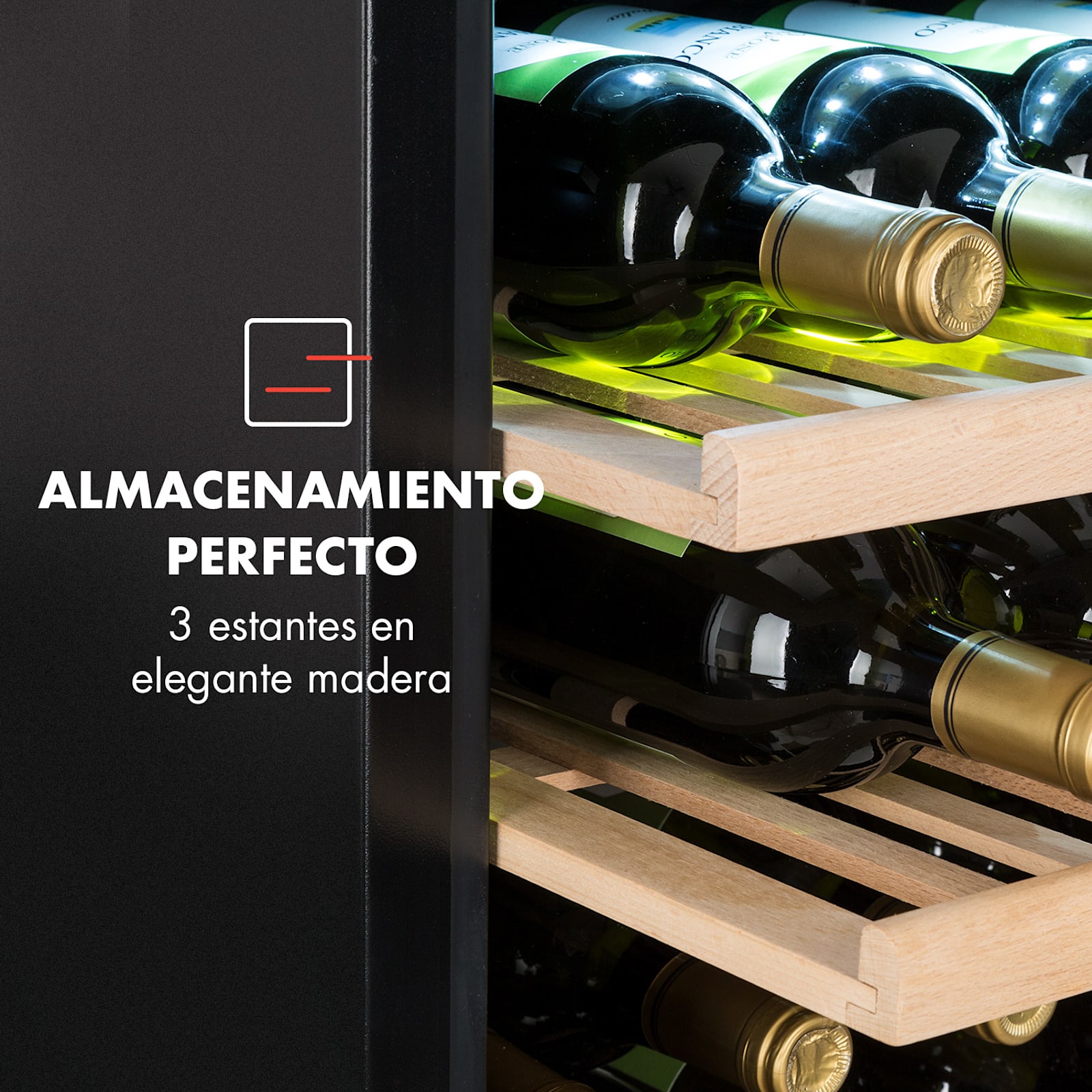 El frigorífico de vino Vinsider 41 Built-in Duo Onyx Edition de Klarstein reinterpreta la clásica bodega de vinos: con un diseño elegantemente impresionante en acero, vidrio y madera. ¡Gracias a la iluminación interior LED conmutable, siempre presenta tus reservas de vino de manera discreta y hábil!